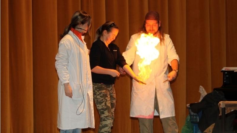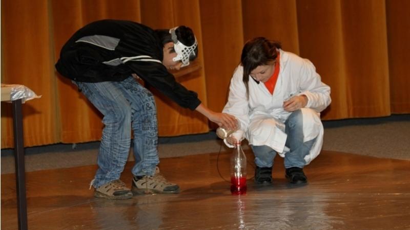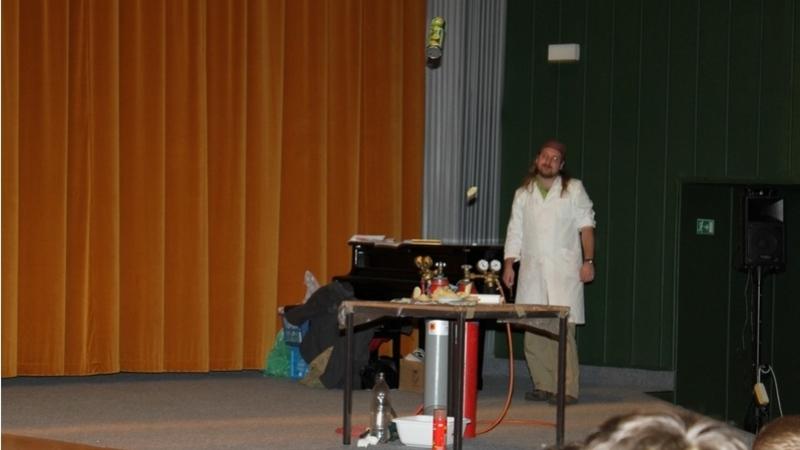 V sálu habartovského kina přivítali žáky dva lektoři odění do bílých plášťů. Na pódiu byly dále připraveny dva stoly plné baněk, chemikálií a dalších pomůcek později využitých při názorných pokusech a také bomby s potřebnými nashromážděnými plyny.