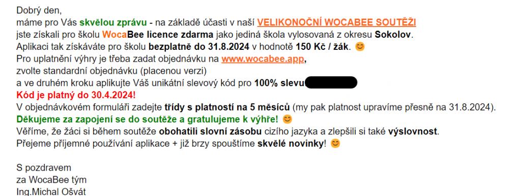 Žáci naší školy se zapojili do velikonoční soutěže s aplikací wocabee a vyhráli licenci do konce školního roku 2023/2024 zdarma. Pochvalu si zaslouží všichni za jejich intenzivní procvičování slovíček v hodinách anglického jazyka. Ale největší díky patří Monice Holecové a Elišce Jacákové ze třídy 6. A, protože holky splnily i domácí přípravu na 100%.