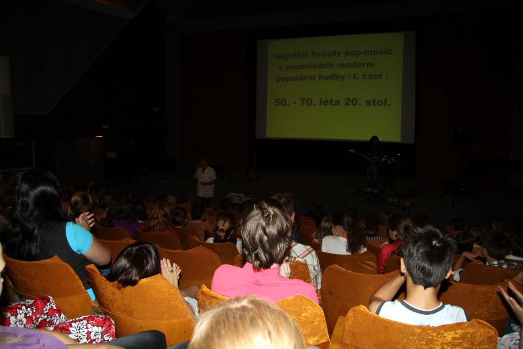 V pondělí se osazenstvo prvního i druhého stupně asi na jednu hodinu přesunulo ze školních lavic do sálu místního kina. Tam je totiž čekal hudebně- naučný program s názvem Vývoj moderní popové hudby 50.- 70. let 20. století