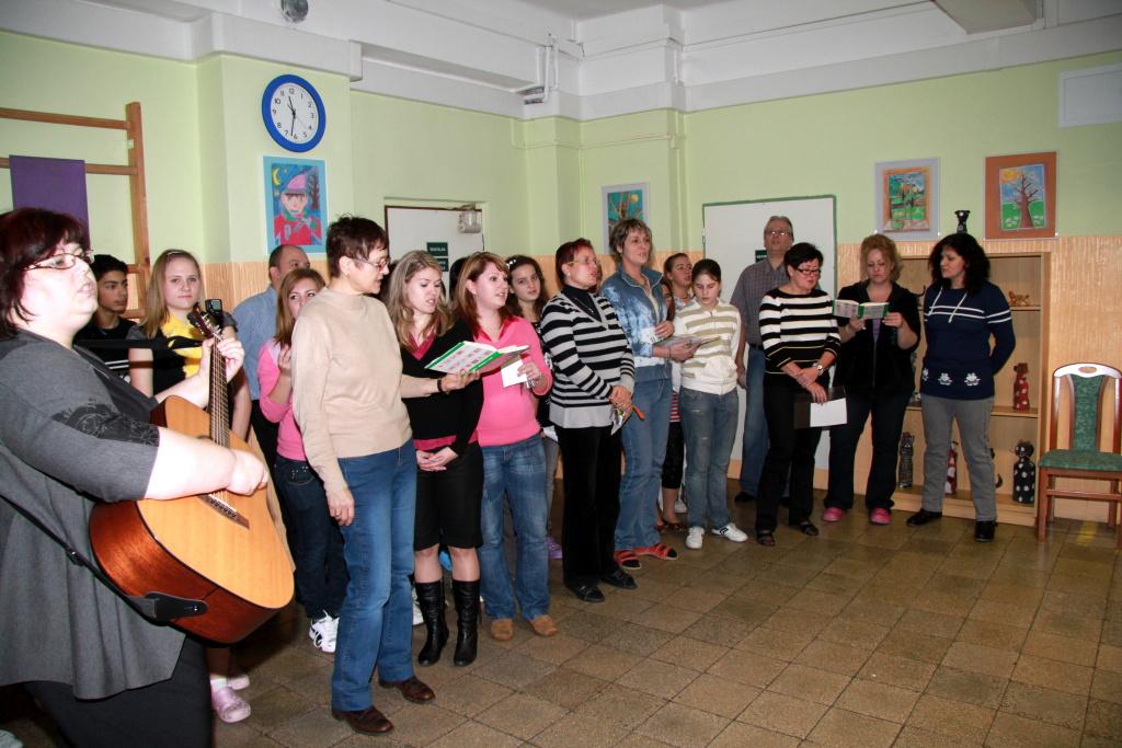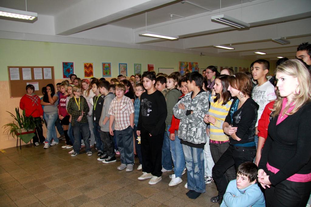 Krátce po začátku čtvrté vyučovací hodiny, která byla pro tento den ustanovena jako poslední, se žáci druhého stupně všichni sešli na hlavní chodbě, kde se uskutečnilo asi dvacetiminutové sváteční vystoupení školního pěveckého sboru, který byl posílen o část místní kapely Fíci. Stejné vystoupení prvňáci až páťáci zhlédli již ráno ve svém pavilonu. Sváteční atmosféra umocněná zvukem basy, houslí, kytary a rytmických nástrojů se usídlila v každém zákoutí a také v každém z nás.