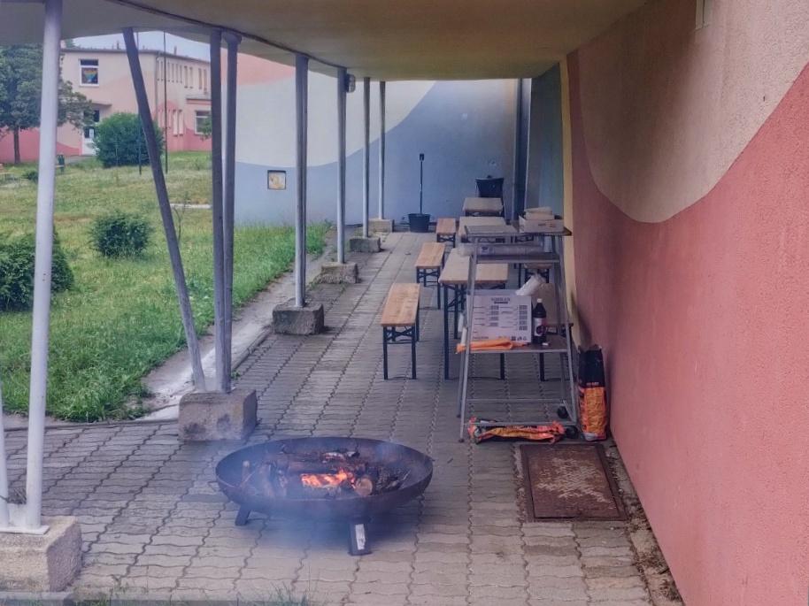 Díky prozřetelnosti pana ředitele a píli pana školníka se podařilo vytvořit hezký koutek s kotlíkem a bistrem v střechou kryté „Spojovačce“ pavilonů A-B.
