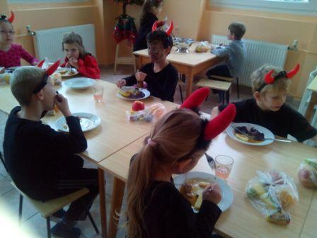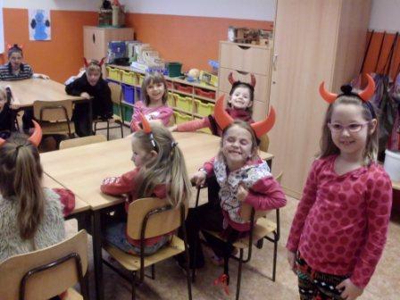 Ve škole se tento pátek, 5. prosince, neučilo…kdepak…. všude byli čerti….Nejinak tomu bylo i ve školní družině. Dokonce i na oběd šla místo vzorných školáčků pořádná tlupa čertisek. Čertovsky se najedli, čertovsky si pohráli a pak si i čertovsky zatancovali….a stihli soutěžit, nafukovat balónky, hrát na „Molekuly“ a s velkým křikem obíhat židle při nejoblíbenější hře „Židličková“…A pak už převléknout, sbalit si věci, obléknout bundy, nazout boty a honem domů…ti „skutečnější“ čerti i s Mikulášem a andělem už byli na cestě…