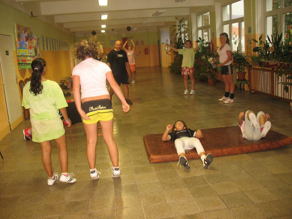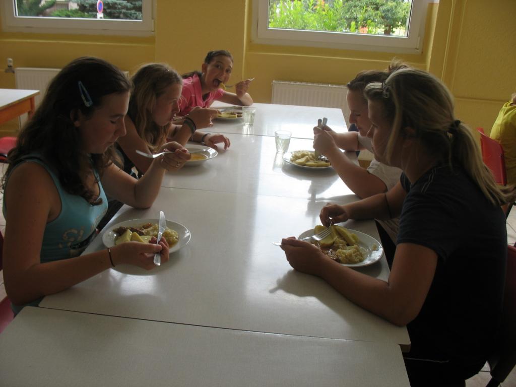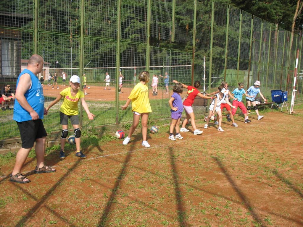 Vstávali jsme v 7:00 hodin bez rozcvičky. Po vydatné snídani jsme se nachystali na dopolední trénink, který se skládal ze tří bloků - smeč, podání, přihrávka. Děvčata obdržela za předvedené výkony body do celkového hodnocení. S ohledem na skutečnost, že fungujeme první den, nejsme nijak limitováni únavou. K obědu byl knedlík s masem a zelím. Chystáme se na odpolední část denního programu. Na pořadu dne je výběh do lesa (krátké kardiocvičení). K svačině zakousneme jablíčko a sušenku.