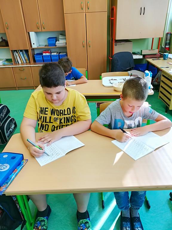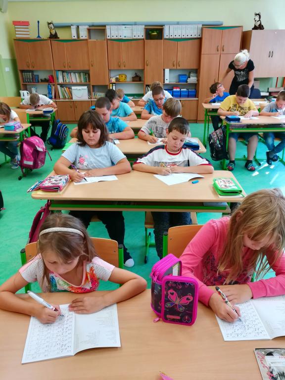 ale přesto si stále musíme připomínat, že se u psaní má sedět rovně, že sešit má být mírně nakloněný, že ruka co nepíše jej přidržuje na spodní straně, že nohy nemají být křížem, ale rovně vedle sebe, že hlava je v ose těla, ne skloněná ke straně!, že pero se drží jen třemi prsty, z nichž prostředníček pero podpírá,