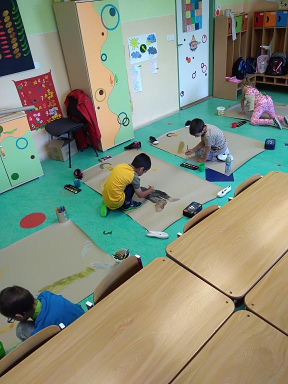 Malování vodovými barvami, míchání barev a vyplňování plochy barvou.