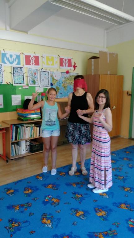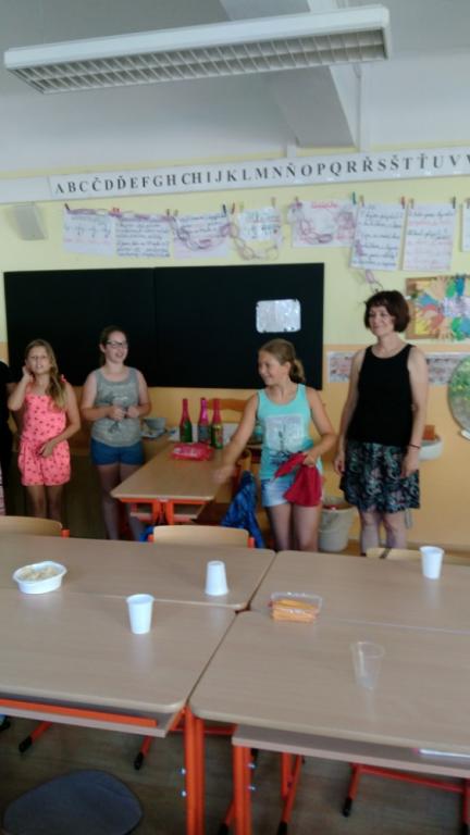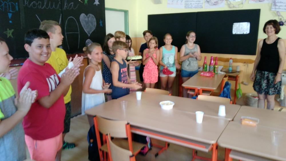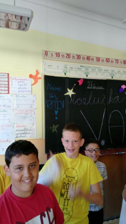 Dne 27. 6. ve čtvrtek se celá 5. A domluvila, že přijde už v 7 hodin ráno a opravdu se všichni sešli. Vše probíhalo ve veliké tajnosti a já jsem musela čekat za dveřmi. Po nějaké době jsem mohla do třídy se zavázanýma očima. Zazněla fanfára na lesní roh, kterou velmi pěkně zahrála Kristýnka Zettlová. Když už mi sundali šátek, uviděla jsem slavnostně vyzdobenou třídu, dort a Pepinka Krausová mi za celou třídu poděkovala. Velkým překvapením také byla prezentace ze života naší třídy za celých pět let, tu přichystala Simča Oswaldová. Nesměly chybět oblíbené písničky v režii Kuby Petra. Byla jsem velmi dojatá, ale zároveň jsem měla velkou radost, že se dokázali společně domluvit a celou akci samostatně zorganizovat. Rodičům bych chtěla poděkovat za spolupráci.