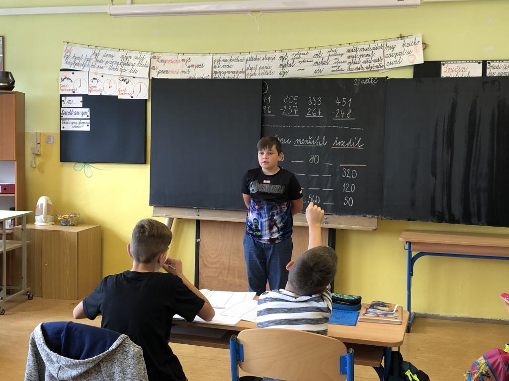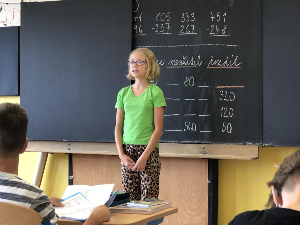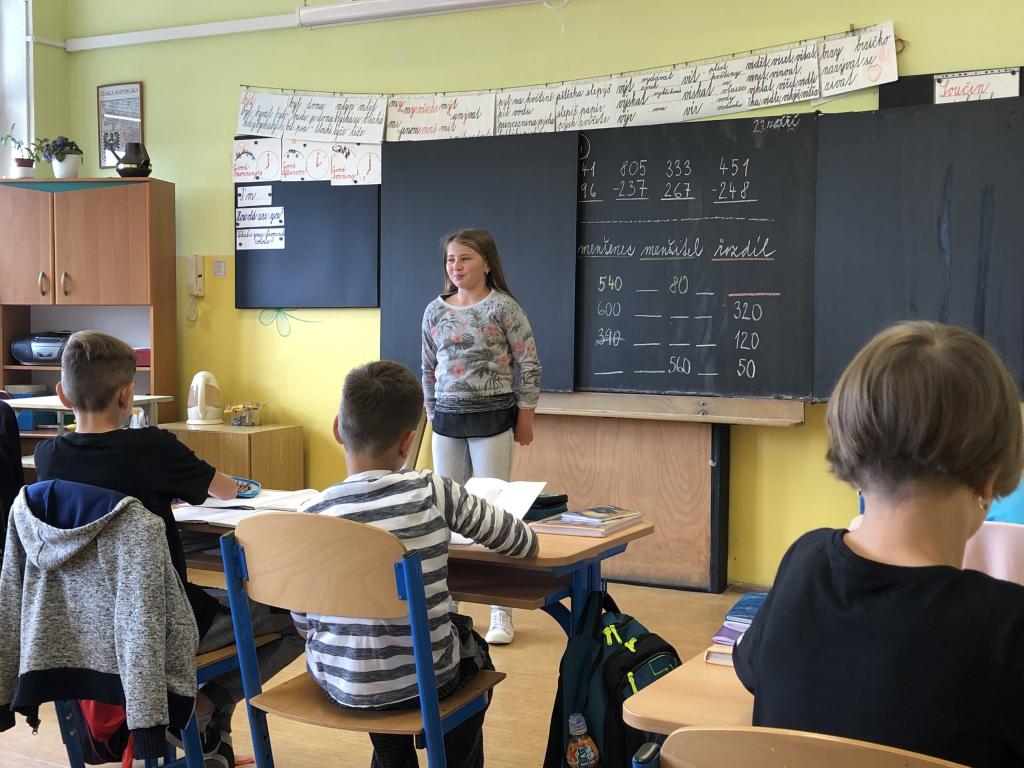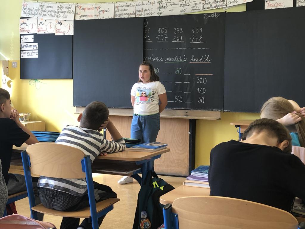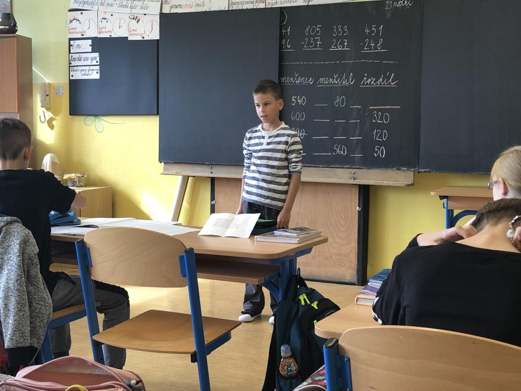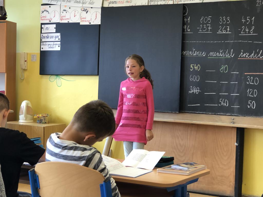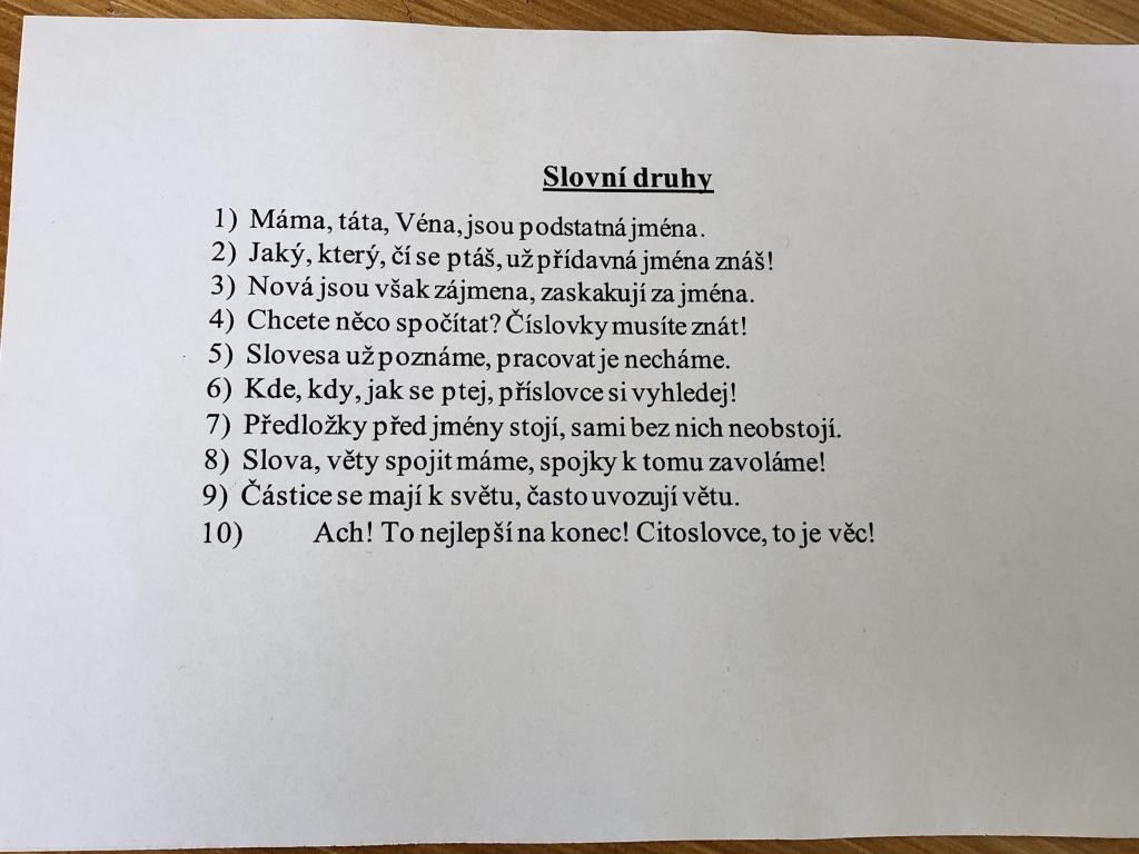 V českém jazyce procvičujeme důležitou látku. Jsou to slovní druhy, se kterými jsme se setkali již ve druhé a třetí třídě. Nyní se je učíme podrobněji, a protože je to těžké, rozhodli jsme se to pojmout jaksi netradičně. Paní asistentka si pro nás připravila báseň, kterou jsme měli za úkol se naučit. Je poměrně krátká, jednoduchá a hlavně snadno zapamatovatelná. Díky této básni nám půjde učení mnohem lépe a určitě ji využijeme i v budoucnu, když si nebudeme jisti, o jaký slovní druh se jedná. Pokud to tak půjde dál, jsme si jisti, že bude výuka českého jazyka i jiných předmětů zajímavější a zábavnější.