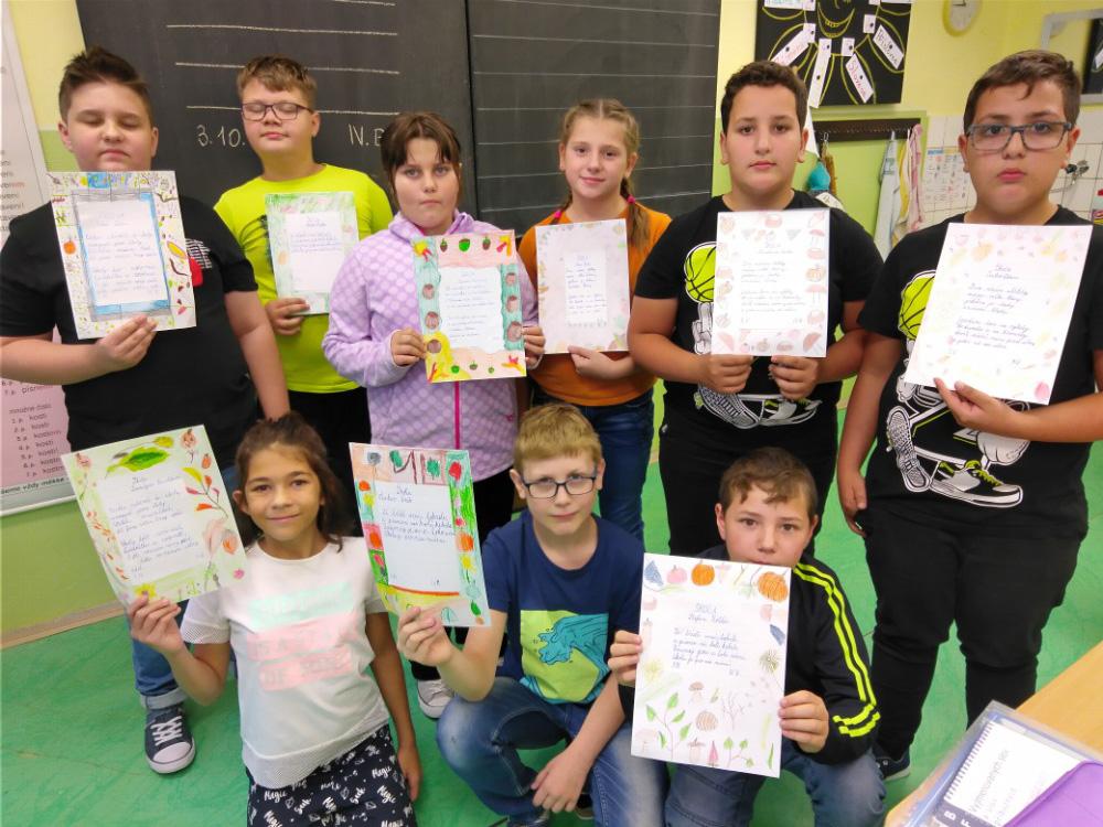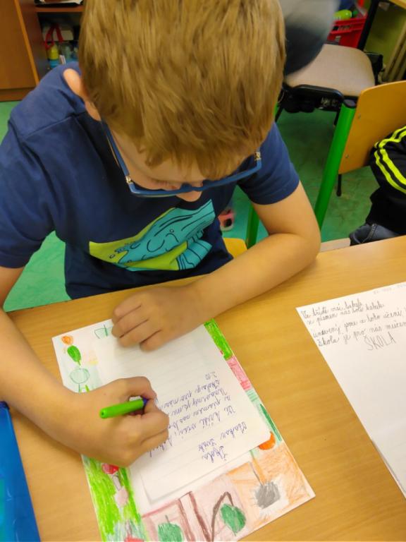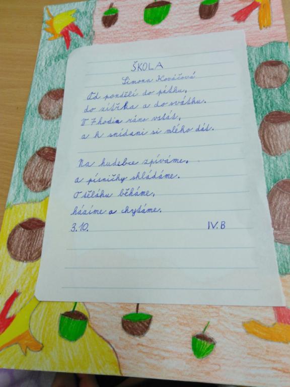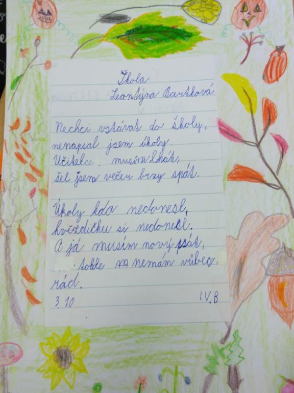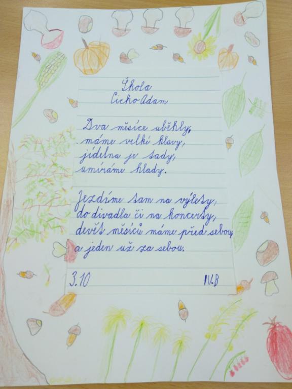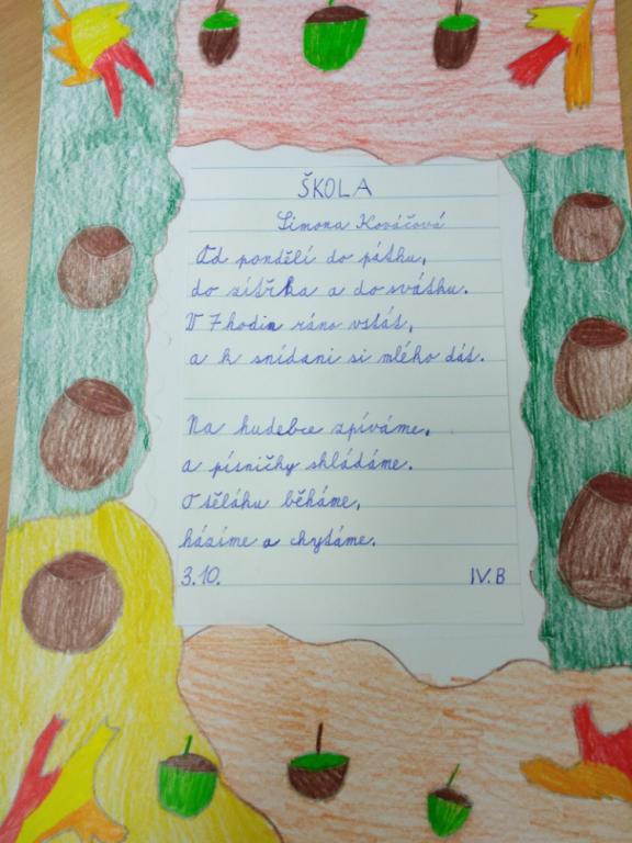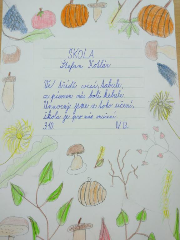 Zajímavá hodina, čteme si básničku, rozebíráme verše, hledáme rýmy, pracujeme s hlasem. Chvilkami se musíme smát, jak legračně báseň vyzní, když při recitaci začne recitátor plakat. Není to lehké měnit nálady, začíná nás to bavit. Tu paní učitelka rozdělí třídu na pět skupin, zadala nám úkol. Zkuste si to, být chvilku básníkem, je vás ve skupině dost na to, abyste společně vymysleli básničku. A téma? No jasně ŠKOLA. Dali jsme hlavy dohromady a opravdu nám to básnění začalo jít. Výsledné básně všech skupin si můžete přečíst na fotografiích. V hodině VV jsme si k nim ještě udělali podzimní podklad. „Kdo ví, možná se naše básně budou jednou také nacházet v čítance.“