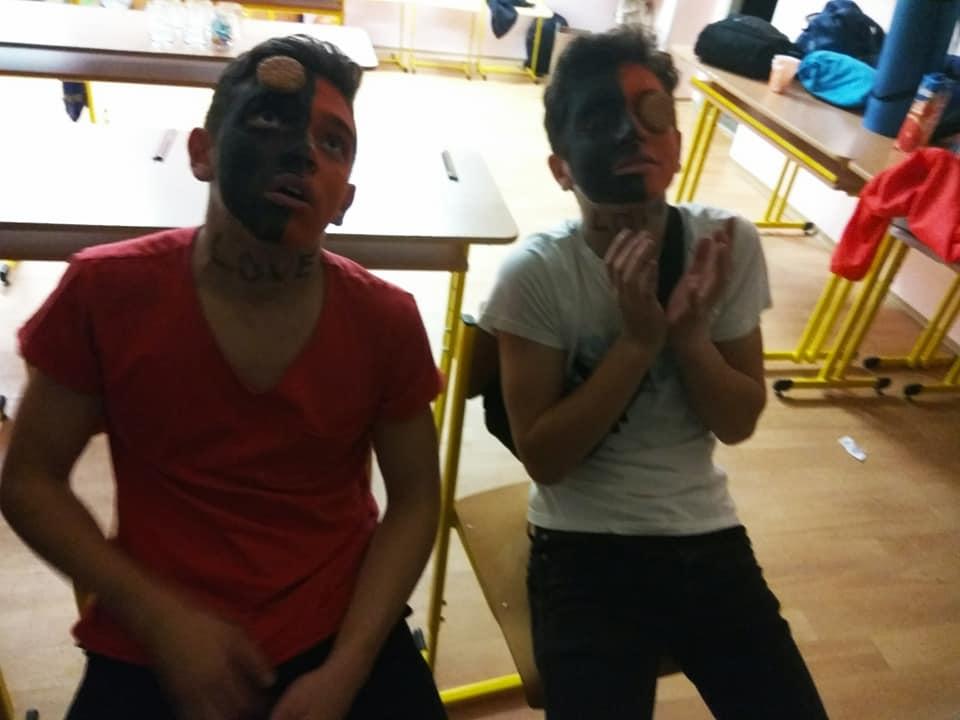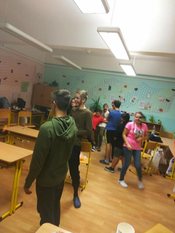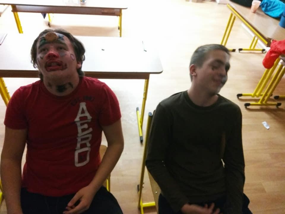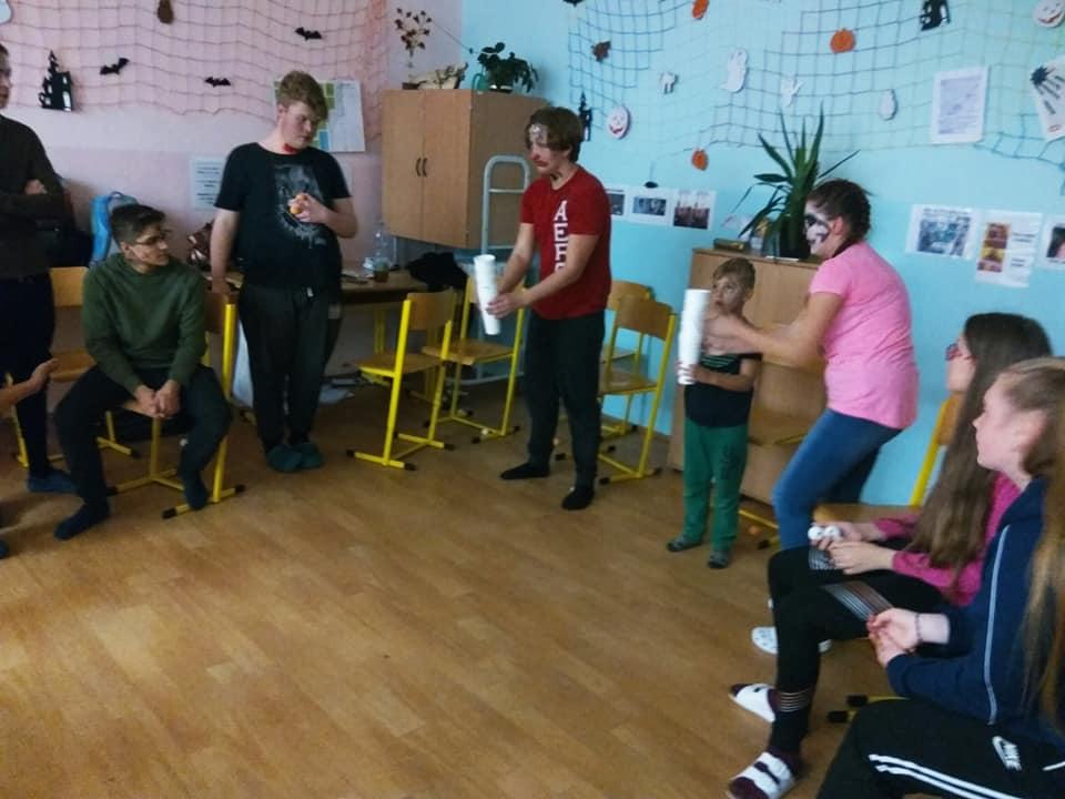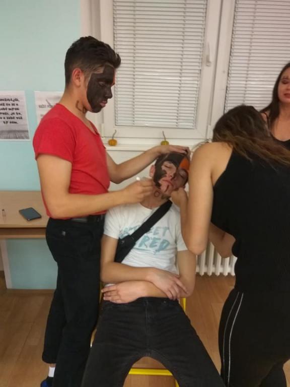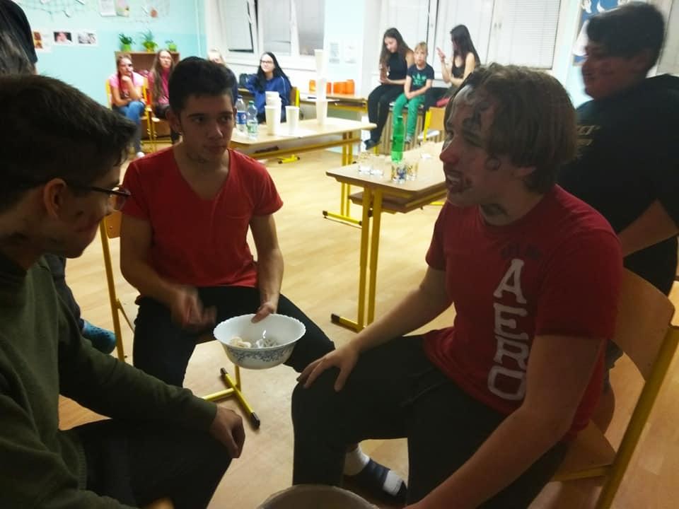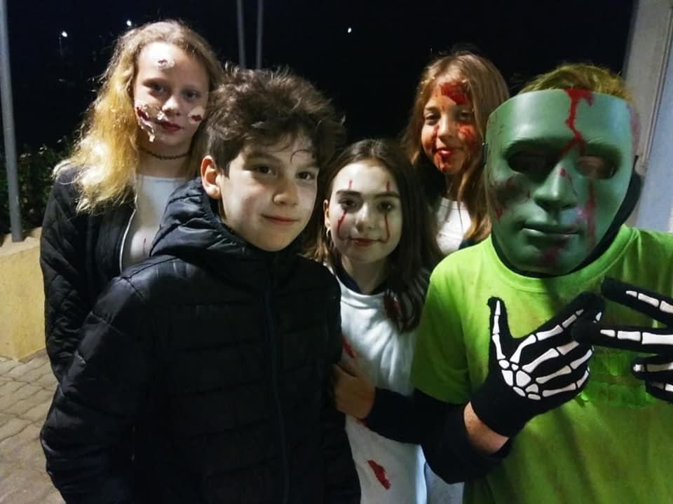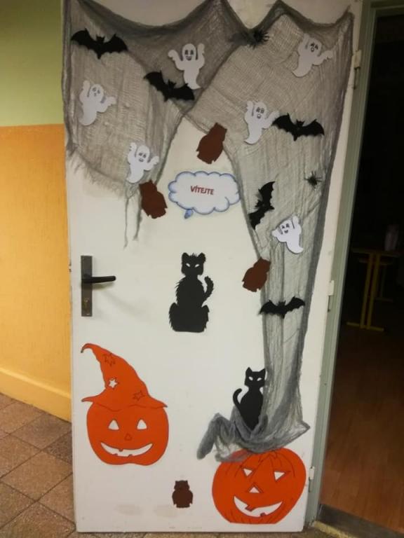 Přestože Halloween nepatří mezi české svátky, nachází i u nás své příznivce. Žáci se v průběhu měsíce listopadu seznámili s historií tohoto svátku, aktivně se podíleli na výzdobě třídy a vyslovili přání se sejít po vyučování a tento svátek oslavit. A tak jsme se domluvili, že si žáci vymyslí masky, převleky a já jim slíbila, že jim tentokrát připravím nějaké hry a soutěže. Nakoupili se barvičky na obličej… to abychom byli nejkrásnější a splynuli s okolím. 25. 10. 2019 jsme se sešli ve večerních hodinách před školou a žáci se po příchodu do třídy pustili do kosmetických úprav tak, aby byli skutečně nejkrásnější. Já, coby třídní jsem této chvíle využila a předala jsem 28 připravených otázek z historie a současnosti Hallowenských oslav dobrovolným pomocníkům 7.A třídy, které jsme společnými silami poctivě poschovávali na zahradě v areálu školy, kam se žáci po setmění, za silné podpory strašidelné hudby vydali hledat otázky s archem odpovědí. Jako orientační body jim sloužily svícny oranžové barvy, které si žáci sami vyrobili, osvícené poctivou svíčkou. Za vydatné spolupráce dobrovolníků z řad žáků 7. A se nám povedlo spolužáky vystrašit, protože ani v koutku duše by je nenapadla poťouchlost p. učitelky si své žáčky vychutnat v podobě vystrašení. A že se povedlo. Asi tak po hodině jsme se všichni sešli ve třídě a věnovali jsme se občerstvení, které bylo složené z želatinových a čokoládových očí, marshmallow bonbony v podobě duchů, na jídelníčku nesměl chybět upíří chrup, pavouci a další laskominy. V čase mlsání jsem spočítala počet odpovědí, které se povedlo najít a také počet správných odpovědí. Nejlépe si vedly Marcelka s Mončou. Poté jsme se vrhli do taneční soutěže a ostatních soutěží. V soutěžích byli nejaktivnější chlapci, kteří se snažili překonat sami sebe… Také Vendy s Helčou nenechaly soutěže v klidu a aktivně se zapojily. Vyvrcholení této akce bylo spaní ve škole. Část žáků se odebrala domů, část do tělocvičny, kde jsme se za hluboké tmy ponořili do spánku. (Někteří). Ráno jsme se všichni řádně vyčerpaní odebrali do svých domovů. Přiložené fotografie jsou důkazem hravosti a soutěživosti žáků této školy.