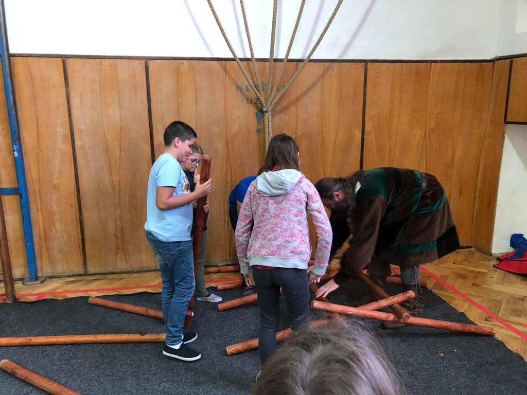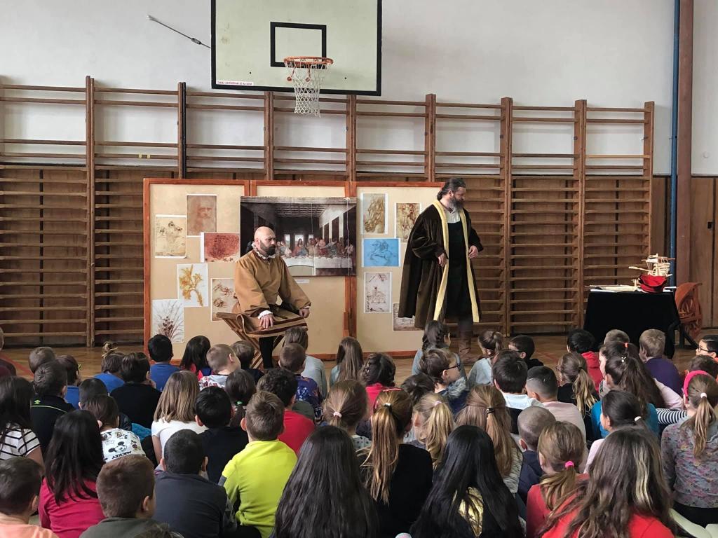 V pondělí 9.12.2019 jsme se v polovině třetí hodiny vydali do tělocvičny, kde na nás čekali zástupci šermířské skupiny Pernštejni, abychom zhlédli představení o nejznámějším a své doby nejgeniálnějším muži. Řeč je o legendárním umělci a vědci Leonardu da Vincim. Nejprve jsme byli seznámeni, kdy a kde se narodil, do jaké doby a jaké byly jeho tvůrčí počátky. Následně jsme byli ponořeni do všemožných vynálezů, plánů a kreseb, které Leonardo vytvořil. Informací bylo mnoho. Díky zajímavému a záživnému představení, jsme se mnohé dozvěděli a snáze si vše zapamatovali. Po skončení představení jsme si mohli všechny vystavené vynálezy a obrazy prohlédnout a vyzkoušet. Vyzkoušeli jsme si, jak se otáčejí ozubená kolečka, někteří z nás měli možnost si postavit most a mnoho dalšího. Představení i přehlídka nás velmi bavila a my už se nemůžeme dočkat, s čím přijedou páni umělci zase příště. Jisté je, že to bude určitě opět poučné a skvělé. Přesně jako toto vystoupení.