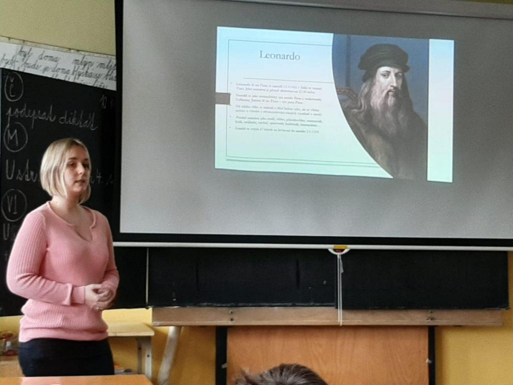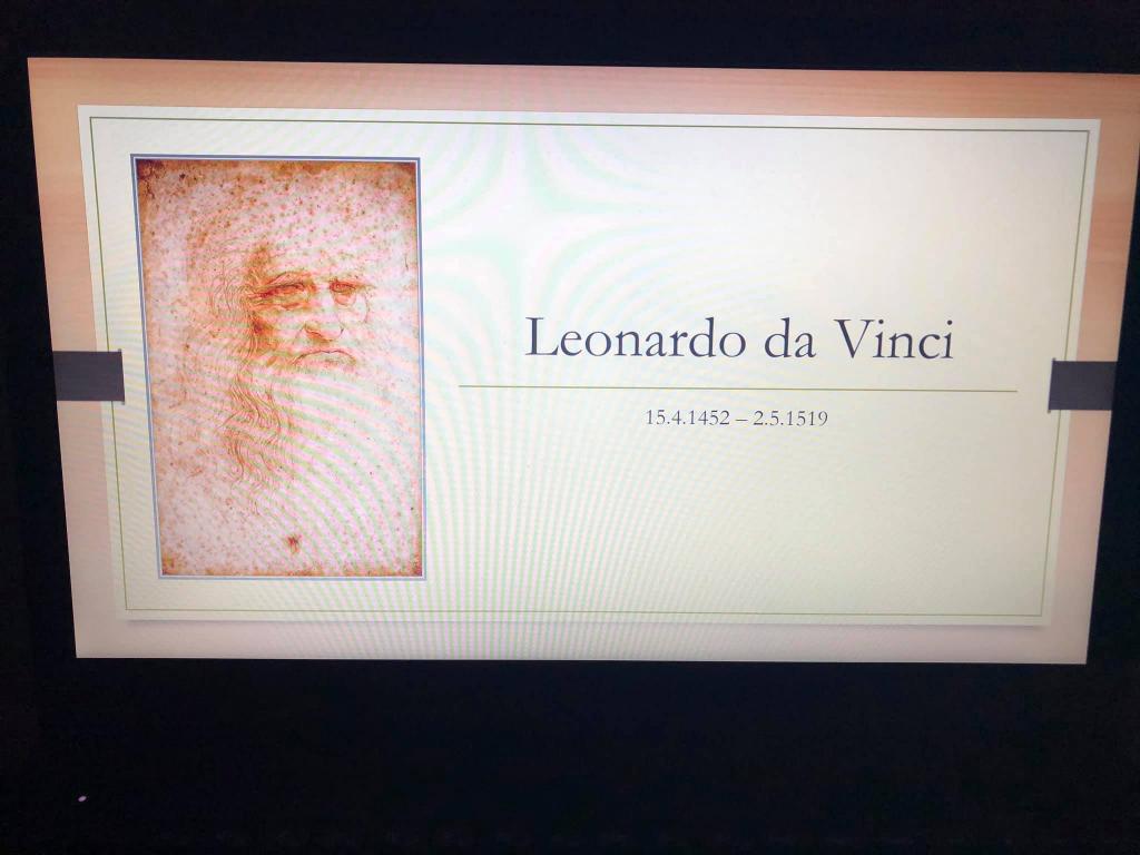 Druhého dne jsme si vše zopakovali. Paní asistentka si pro nás připravila krátkou prezentaci, kde nám tohoto významného člověka představila a poodhalila nám různé zajímavosti z jeho života. Dozvěděli jsme se například, že byl velkým zastáncem a ochráncem zvířat. Po celý život byl vegetariánem. Narodil jako nemanželský syn významného notáře a venkovanky. Čas jeho narození byl hodinu a půl před půlnocí 15.4.1452. Na závěr hodiny, abychom všechny načerpané znalosti využili, jsme si vyplnili test. Ten nám připravili představitelé šermířské skupiny. Nyní budeme na Leonarda i na jeho díla nahlížet jinak než doposud.