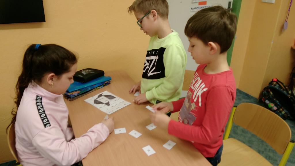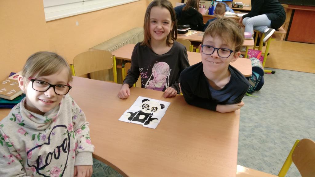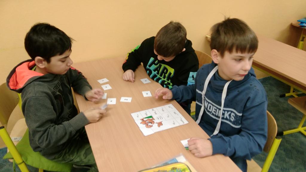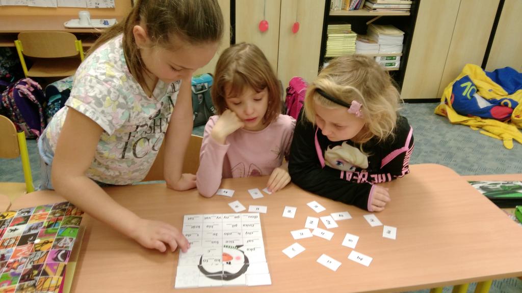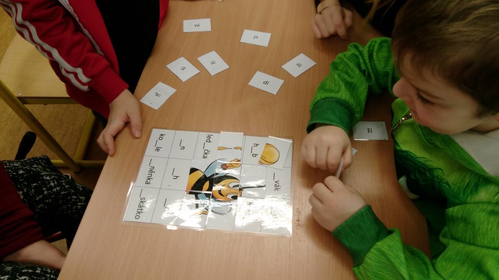 V českém jazyce se snažíme zdokonalovat a různými metodami automatizovat učivo. Právě probíráme tvrdé a měkké souhlásky. Pokud ke slovům přiřadíme správné slabiky, podaří se nám poskládat obrázek. Aby se nám to povedlo, musíme si ve skupinách pomáhat. Protože spolupráce funguje velmi dobře, podařilo se poskládat obrázek ve všech skupinách.