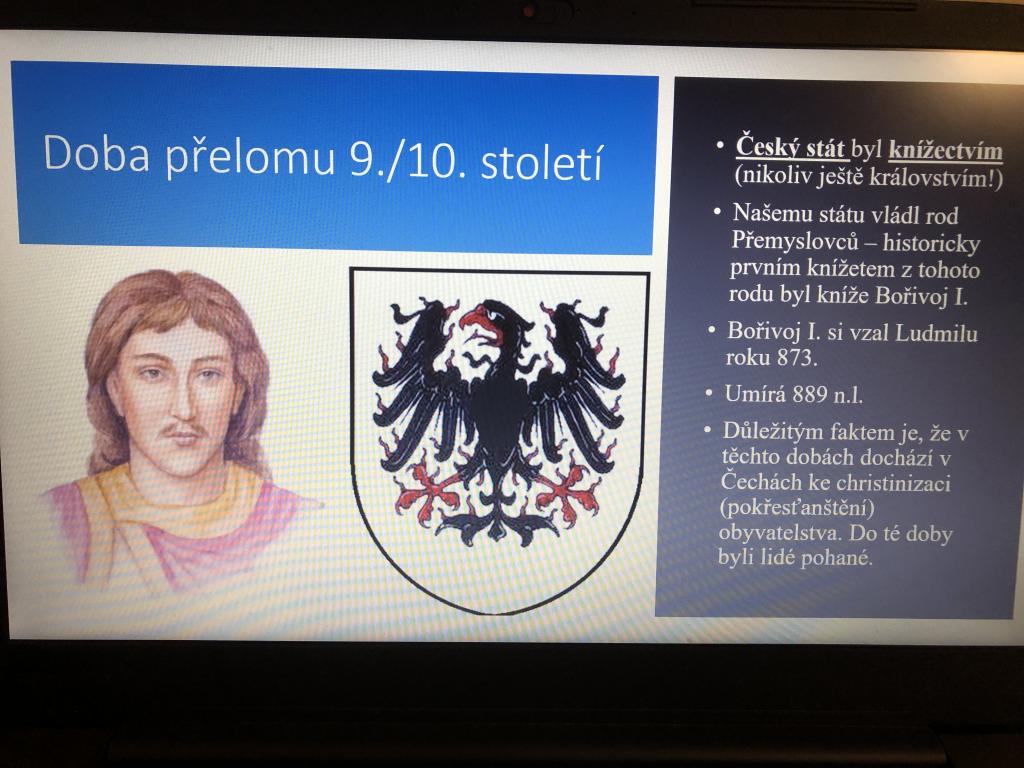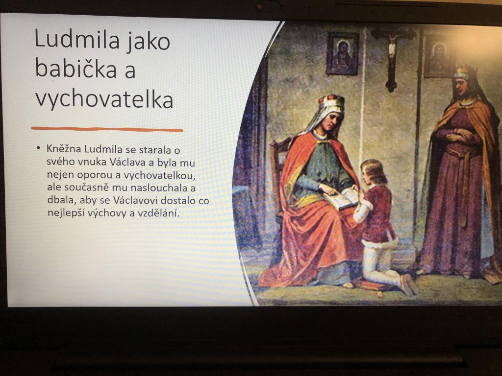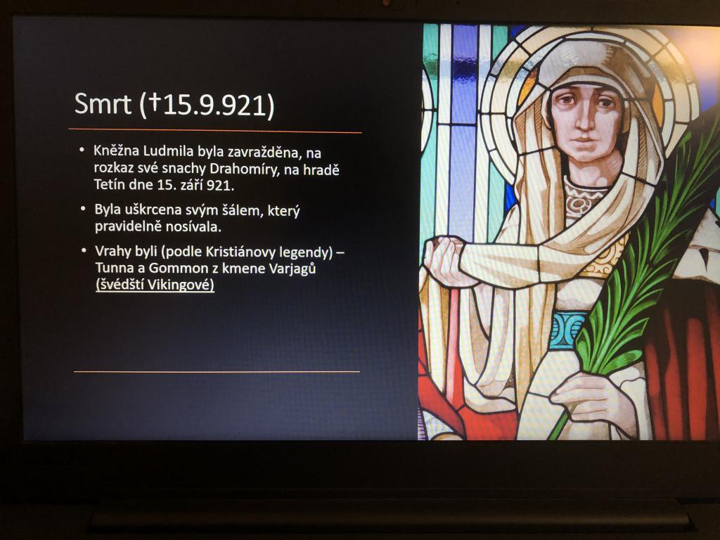 Ačkoliv se může zdát, že datum 15. září 2021 není nijak významné a jde o obyčejný den, opak je pravdou. My v 6.A moc dobře víme, jaká událost z tohoto dne se zapsala do dějin tak významně, že je třeba ji připomínat. Přesně před 1100 lety byla zavražděna česká kněžna Ludmila, která díky svému skromnému životu a mučednické smrti byla ve 12. století svatořečena a my ji známe jako Svatou Ludmilu. Paní asistentka, která studuje historii, si pro nás připravila o svaté Ludmile zajímavé povídání nejen do hodiny dějepisu, ale taktéž do hodiny zeměpisu. V hodině dějepisu jsme se dozvěděli, že Ludmila byla zakladatelkou přemyslovského rodu, že byla manželkou Bořivoje I., starostlivá babička svého vnuka Václava (kterého známe jako svatého Václava) a také to, že za jejího života docházelo k rozvoji křesťanství na našem území. Ludmila, i přes svůj vznešený původ, měla bohužel tragický konec. Měla příliš velký vliv na svého vnuka Václava a chod země, což se nelíbilo její snaše Drahomíře. Nakázala tedy svou tchyni zavraždit. K činu došlo 15. září 921 a Ludmila byla uškrcena svým šálem. O dvě století později byla svatořečena a dnes je známa jako patronka matek, babiček, ale také učitelů. Během vyprávění nám paní asistentka představila nejen českou politickou scénu 10. století, ale také náboženskou situaci, kdy docházelo k rozšiřování křesťanství po celé tehdejší Evropě. V hodině zeměpisu jsme si ukázali místo, kde byla zavražděna - hrad Tetín a pověděli si, že z hradu je dnes jen zřícenina, která leží ve Středočeském kraji.