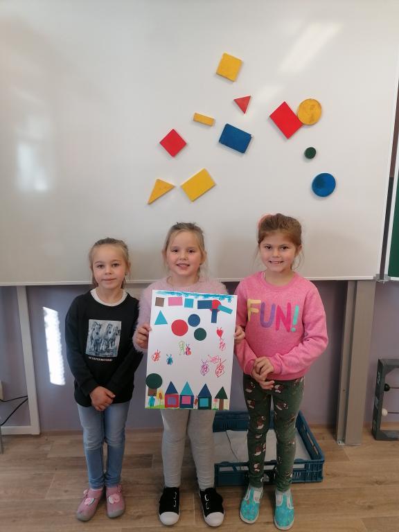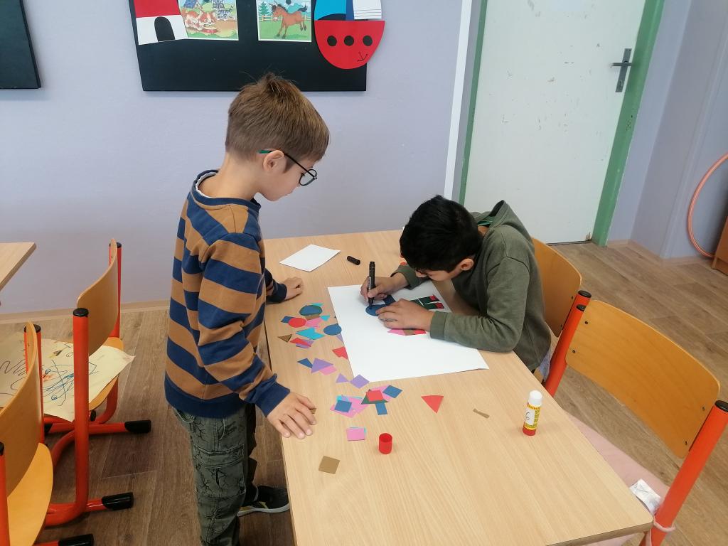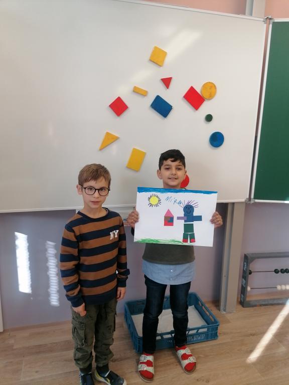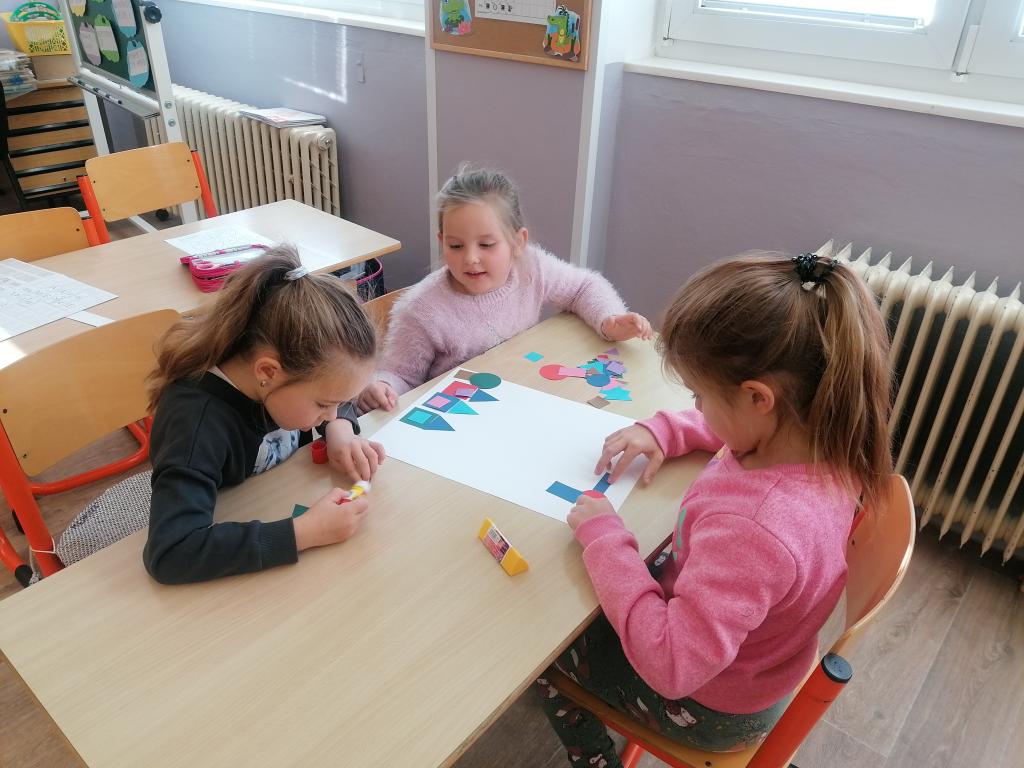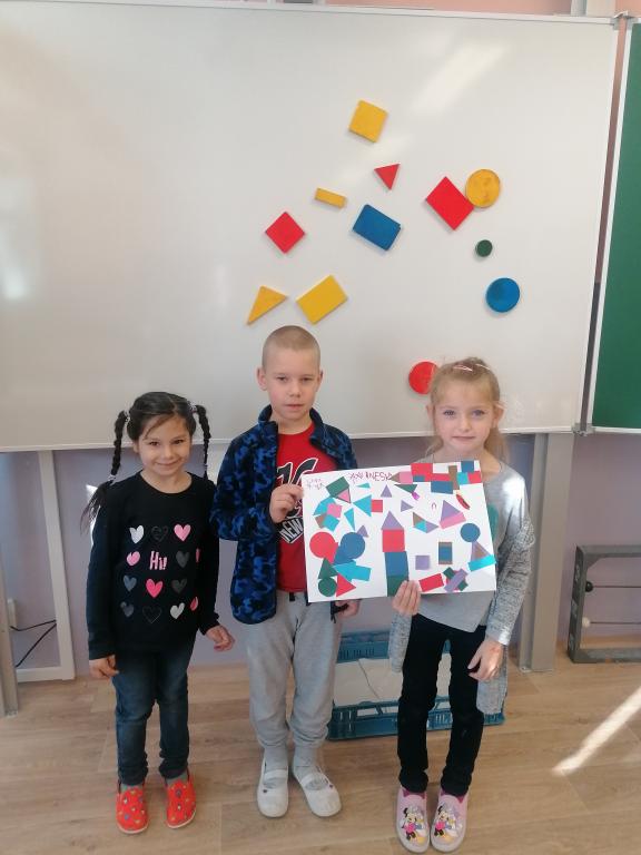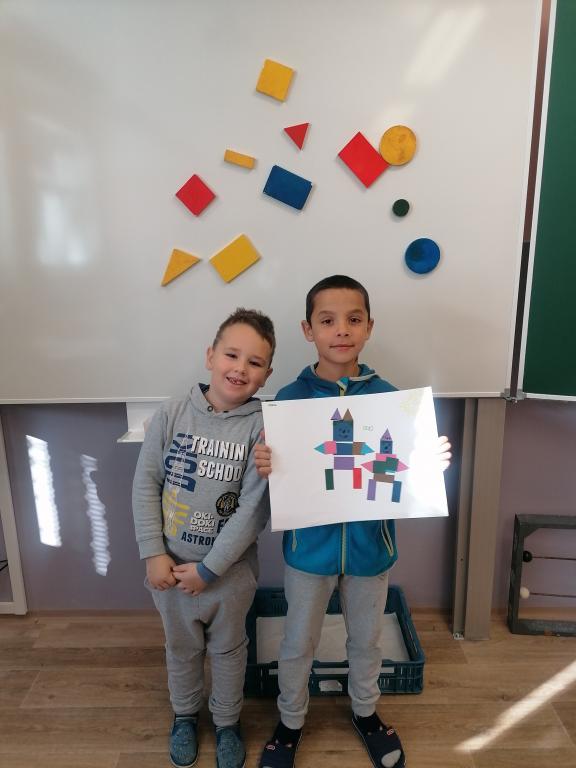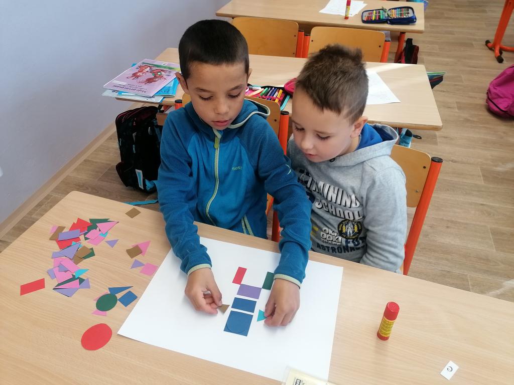 Dnes jsme v hodině matematiky probírali geometrické útvary. Ve druhé části hodiny byli žáci rozděleni do skupin. Každá skupina dostala obálky s geometrickými útvary různé velikosti i barvy. Z nich žáci vytvářeli obrázky dle jejich fantazie.