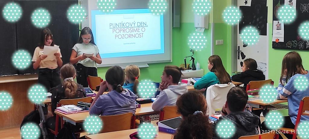 29. října 2021 se koná celorepubliková akce s názvem "Puntíkový den." Je to speciálně organizovaná akce, kdy by si lidé měli obléci puntíkové oblečení a zamyslet se nad zákeřnou nemocí, o které se velmi málo hovoří a o které málokdo ví. Tou nemocí je lupenka, nebo-li psoriáza, či psoriatická artritida. My v VI.A jsme si tuto událost připomněli v úterý 26. října. Někteří z nás si oblékli oblečení s puntíky, kluci vytvořili skvěle vypadající 3D puntíky a děvčata zas barevné nápisy. Zkrátka zapojili jsme se všichni. Jak nám to slušelo, se můžete podívat níže v galerii. V hodině výchovy ke zdraví nás čekalo zajímavé povídání, které si pro nás připravily Kačenka a Dominička. Během jejich vyprávění jsme se dozvěděli, co všechno nemoc s názvem psoriáza obnáší, jak se projevuje, zda je dědičná, jak na člověku vypadá a jak se s takovou nemocí žije. Dívky nám ukázaly rovněž zajímavé video a na závěr si připravily pro své posluchače otázky. Jelikož jsme pozorně poslouchali, uměli jsme odpovědět na každou z nich. Kačence i Dominičce patří velké poděkování a ještě větší pochvala, protože se tomuto tématu věnovaly naplno a jejich úsilí bylo náležitě oceněno nejen jedničkou do žákovské knížky z předmětu výchovy ke zdraví, ale rovněž dlouhotrvajícím potleskem celé třídy. Od nynějška budeme na tuto nemoc nahlížet s respektem a v případě, že bychom se s ní měli setkat, budeme vědět, jak se zachovat správně.