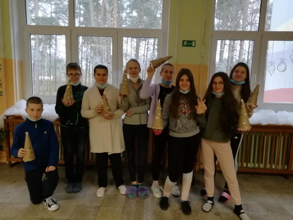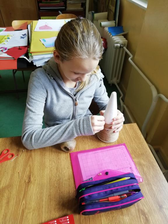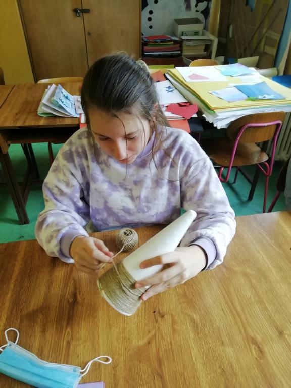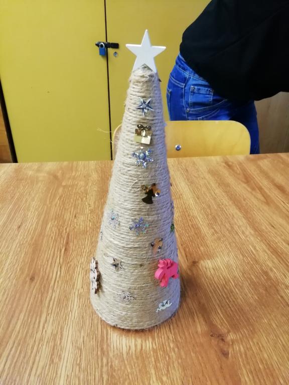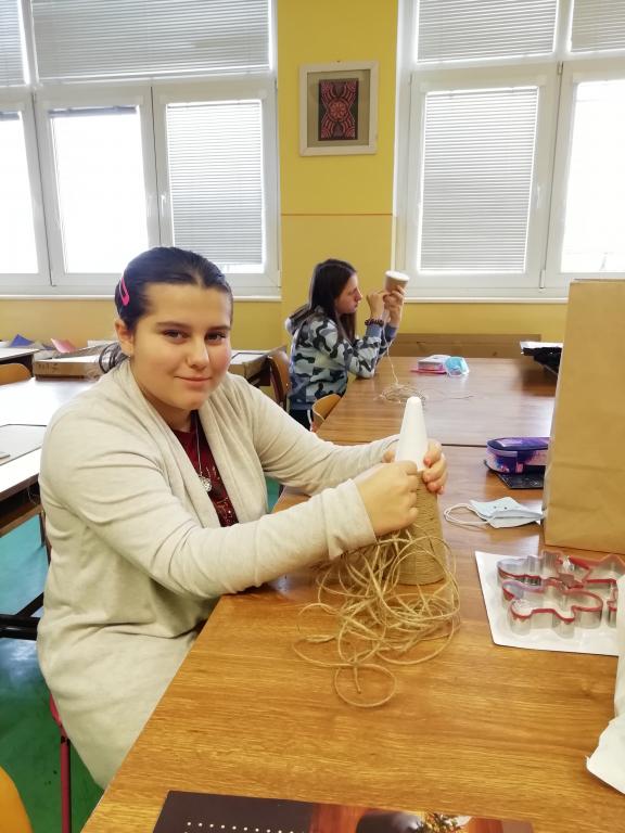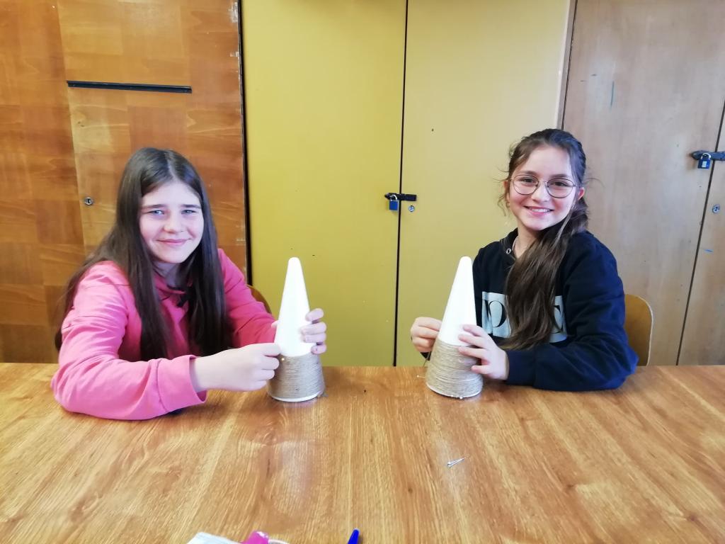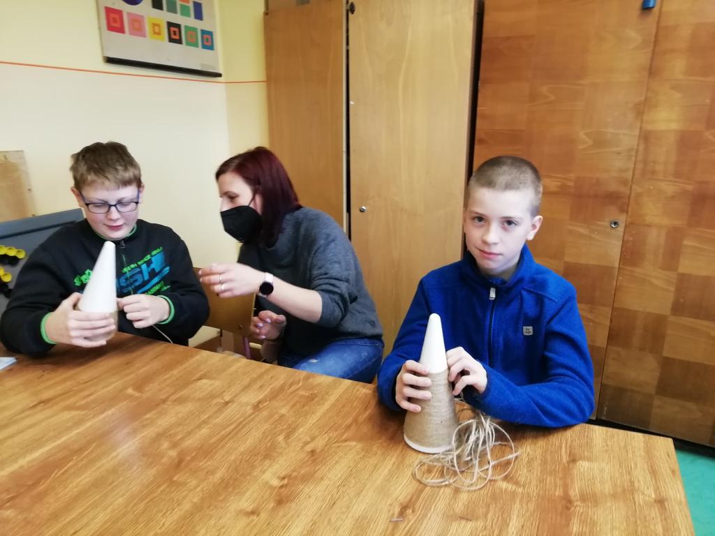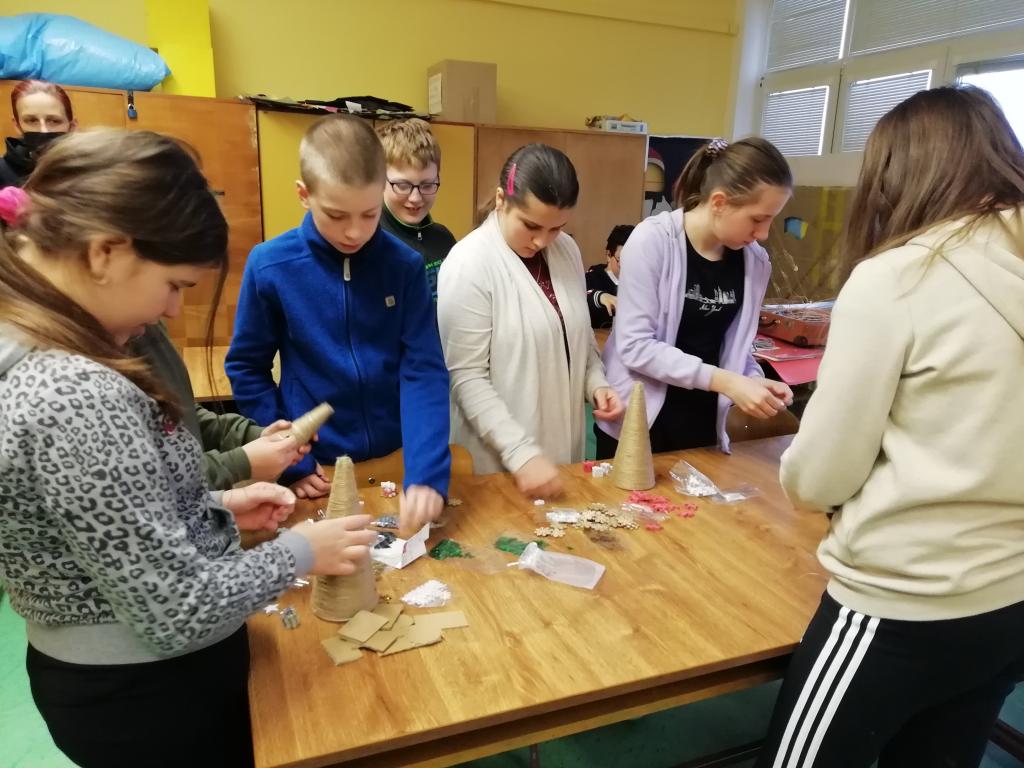 V rámci pracovní výchovy jsme se rozhodli s žáky třídy 6.B přispět k vánoční výzdobě školy. Nakoupili jsme polystyrenové kužely, jutový provázek, drobné dekorační předměty, hřebíčky a mohli jsme začít. Všichni žáci ve skupině se opravdu snažili odvést dobrou práci. Stromečky vypadají nádherně a já musím moc pochválit Nikolku, obě Simonky, Nelču, Denisku, Alici, Otu, Matyho a Štefana za skvěle odvedenou práci.