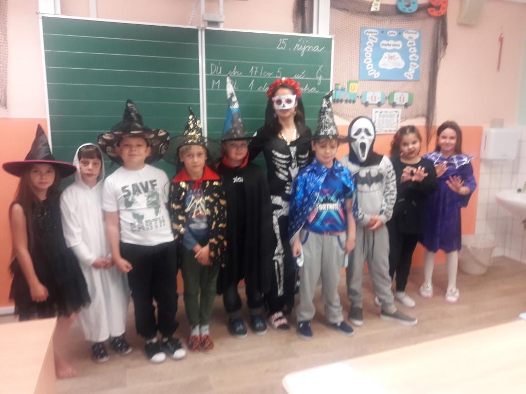 Halloween je anglosaský lidový svátek, který se slaví 31. října. Tradiční barvy Halloweenu jsou černá a oranžová. Oblíbené halloweenské kostýmy symbolizují „zlé duchy", tj. všechno, čeho se obvykle bojíme - čarodějky, strašidla, černé kočky, pavouky, upíry, příšery, kostlivce atd. Děti přišly do školy v různých strašidelných kostýmech a tím dokreslily halloweenskou atmosféru.