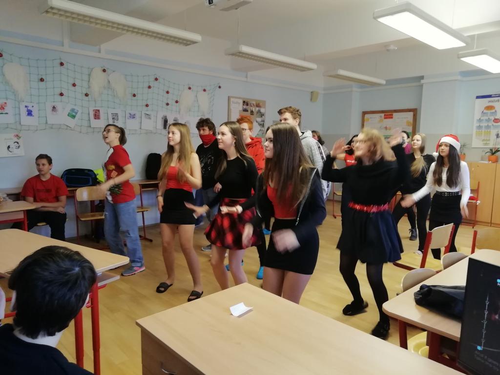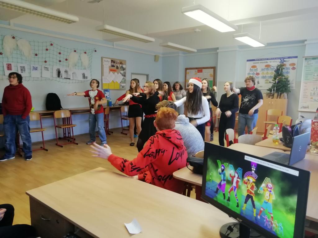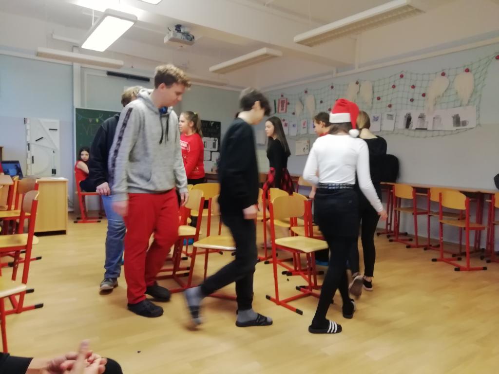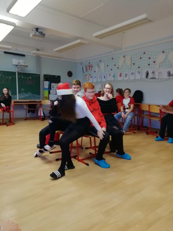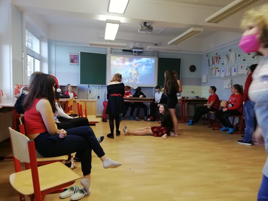 Hrála se hra „židličkovaná“, tancovalo se „Just dance“. Nezapojovala se celá třída, někteří seděli a koukali, po chvilce se nakonec přidali. Také se přidala paní asistentka a paní učitelka Vaňková. Podle mě je to bavilo ze všech nejvíce.