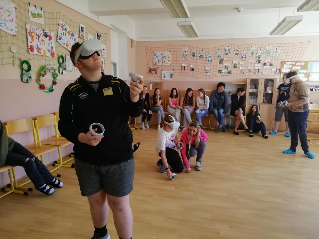 Dne 2.- 3. 6. 2022 k nám přijely dvě paní s Virtuální realitou od značky Oculus. Na začátku pro nás měly připravenou prezentaci, kde nám ukázaly celou historii VR a potom už nás čekalo samotné vpuštění do světa virtuální reality. Nejprve jsme si museli projít začátečnickou zkouškou a vyzkoušet například jak něco uchopit, hodit atd. Tancovali jsme s robotem a stříleli jsme z pistolí na různé předměty. V dnešní době se virtuální realita uplatňuje v mnoha oborech, například v medicíně při operacích. Všem se to moc líbilo!