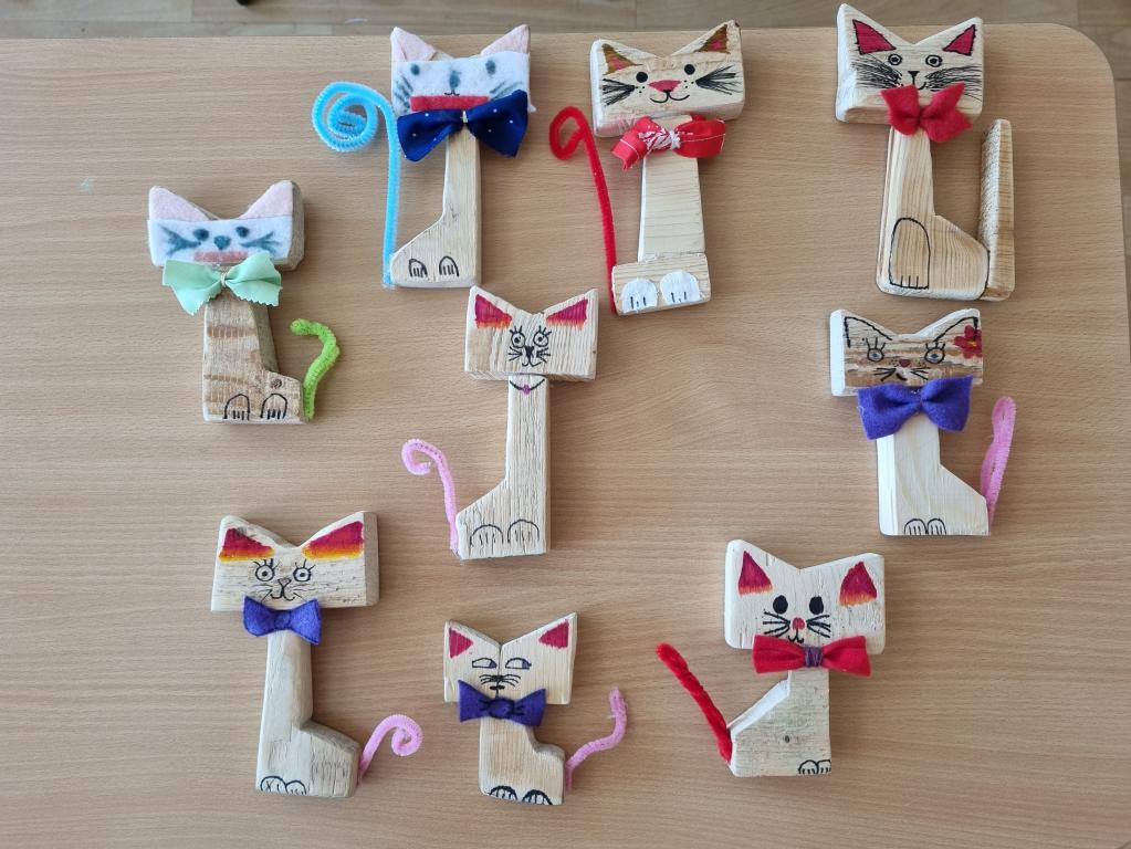 Šablony na naše kočičky jsme si začali připravovat 3. listopadu. Jakmile jsme šablony načrtli a vystřihli, začali jsme chodit střídavě s druhou polovinou třídy do dílen. V dílně jsme dostali kus dřeva, na které jsme si obkreslili jednotlivé části těla té naší kočky. Pak jsme je postupně začali vyřezávat pilkou. Než jsme to vše vyřezali a osmirkovali, tak už byl květen. Paní učitelka s paní asistentkou nám pomáhaly, abychom to nakonec všechno zvládli. A povedlo se. Pak už jsme naše výtvory jen krásně vyzdobili. No a hurá máme památku na dílny v šesté třídě. Myslíme si, že se nám to všem povedlo a moc se nám to líbí!
