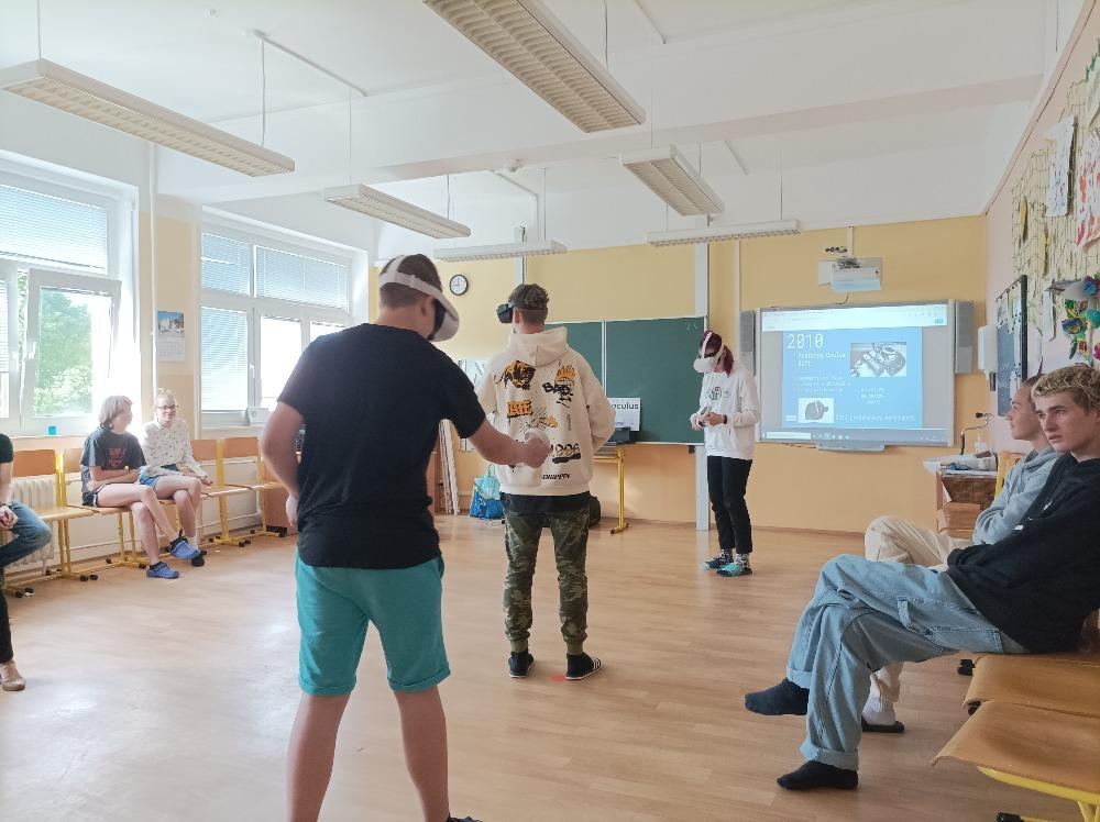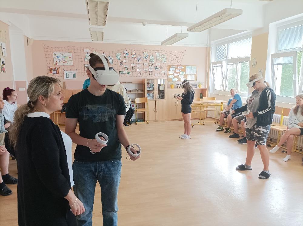 Pátku, dne 3. 6. 2022, jsme se nemohli dočkat. Do školy totiž přijely dvě paní s virtuální realitou. Zhlédli jsme připravenou prezentaci, při které jsme si prošli celou historii virtuální reality. Potom jsme dostali speciální brýle a ovladače. Nejprve jsme si museli zkusit, jak pracují virtuální ruce. Uchopit a hodit vlaštovku byla pro nás hračka. Odpinknout pálkou míček na stolní tenis a vypustit raketu do vesmíru jsme také zvládli na jedničku. Střílení z pistolí na různé předměty byla zábava nejen pro kluky, ale i děvčatům se podařilo nasbírat spoustu bodů. Paní učitelce se nejvíce líbil tanec s robotem. Každý si našel svou zábavu. Těšíme se na další takovou prima akci.