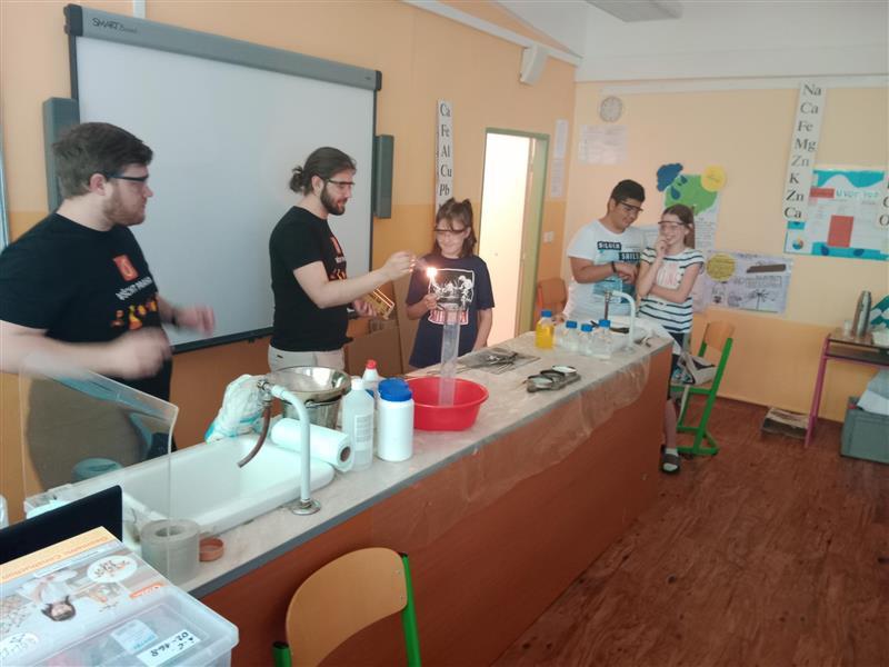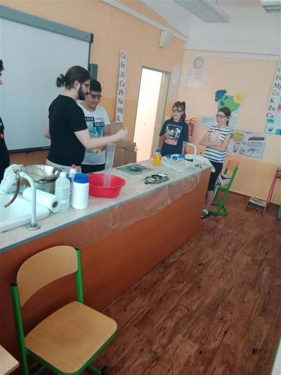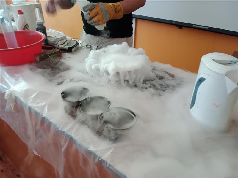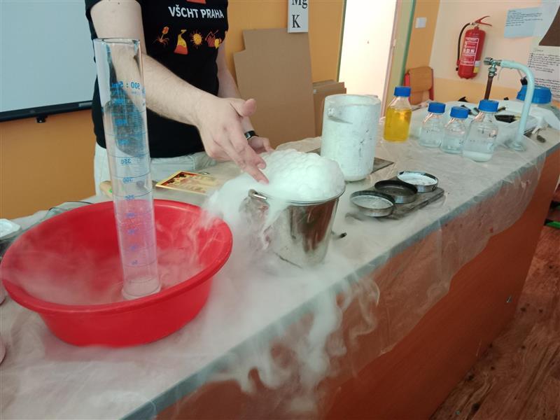 Do školy přijeli 2 odborníci z pražské vysoké školy, aby nám ukázali základy chemie. Viděli jsme vodu, která zamícháním měnila barvy, drželi jsme suchý led, hráli jsme si s pěnou ze suchého ledu, jaru a vody. Nafukovali jsme i ''balónek'' dusíkem, zapalovali střelný prach, papírky a vatu, které v ruce drželi naši spolužáci Dominik, Dominika a Kiki. Páni chemici nám nakonec vyrobili růžovou banánovou zmrzlinu z dusíku a suchého ledu.