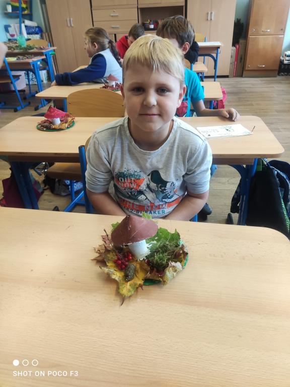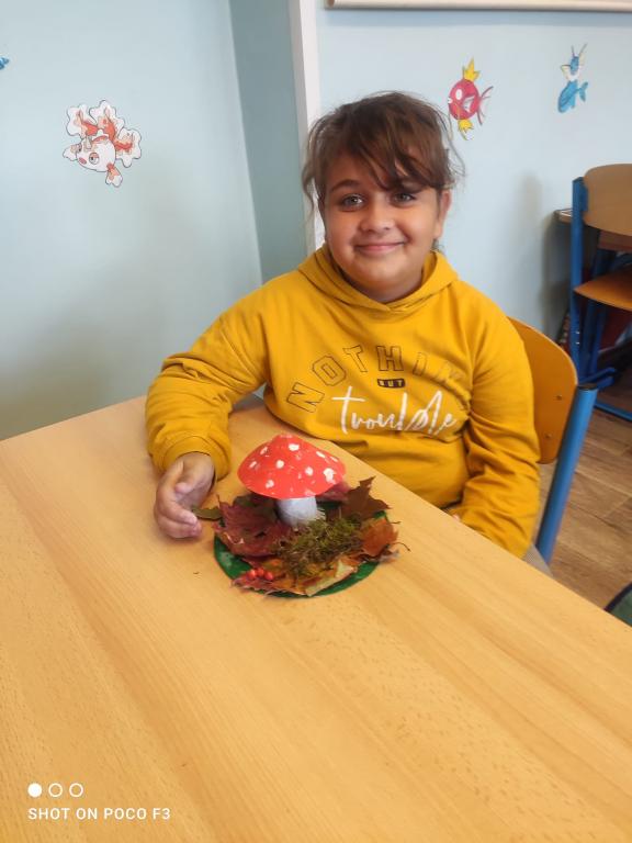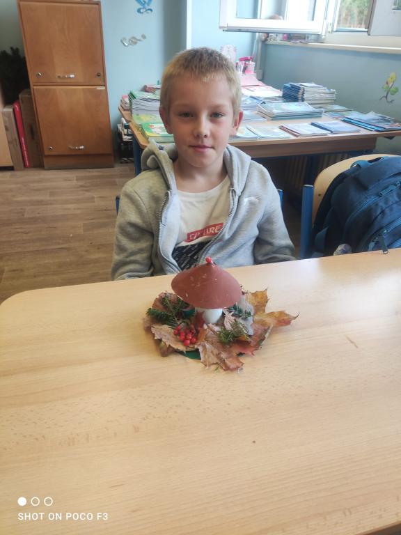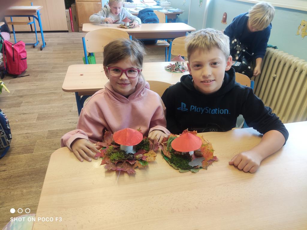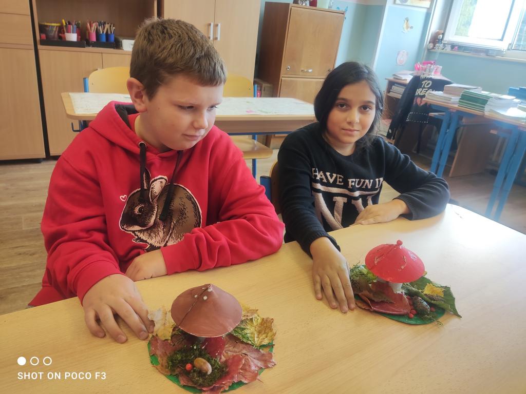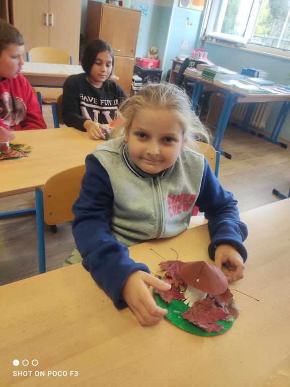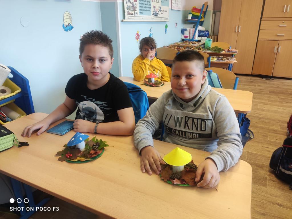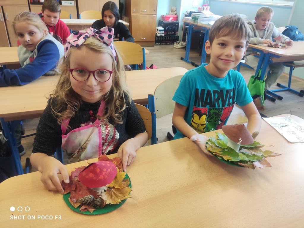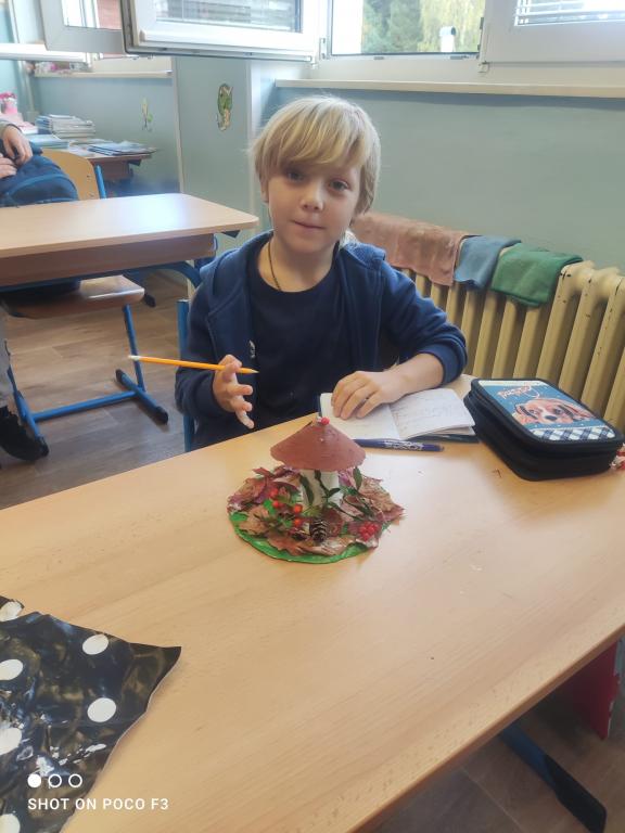 Během prvouky jsme šli pozorovat podzimní přírodu. Když jsme však při procházce nenalezli žádné houby, rozhodli jsme se si nějaké vyrobit sami. Proto místo sbírání hub, jsme shromáždili všemožné přírodní materiály a v pátek při výtvarné výchově jsme se pustili do práce.