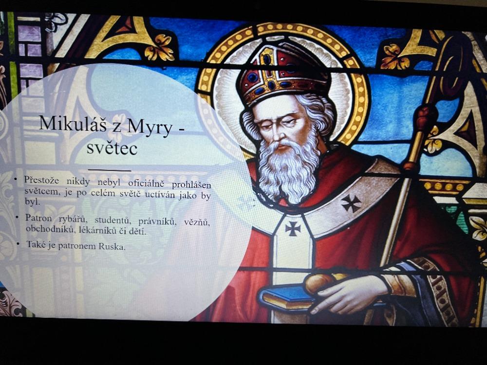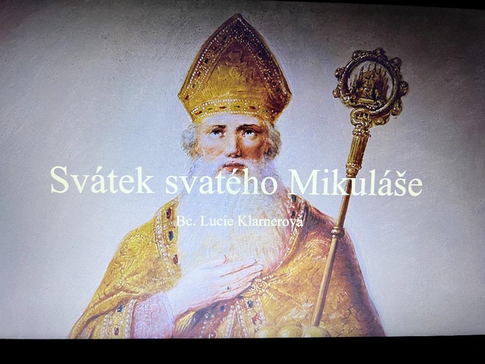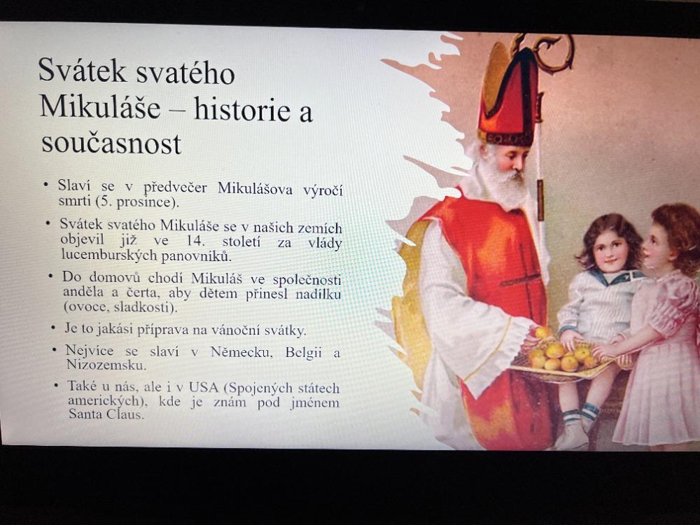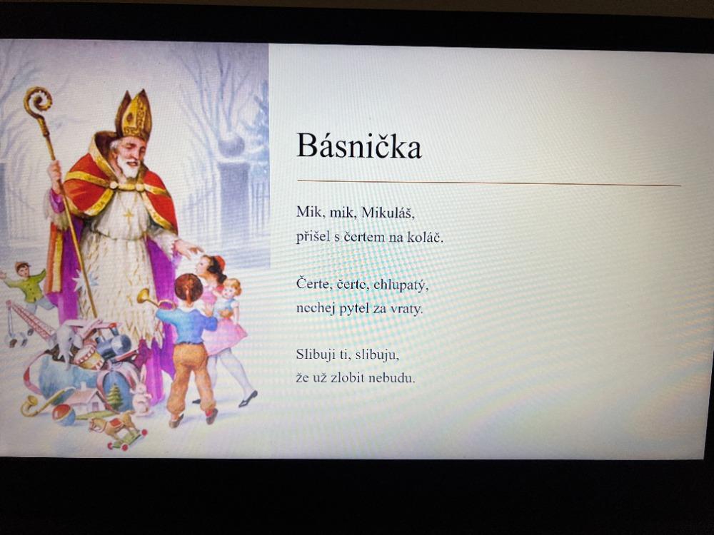 Paní asistentka si pro nás připravila prezentaci, kde nám osobnost svatého Mikuláše představila. Dozvěděli jsme se, že Mikuláš byl moc hodný, pomáhal chudým, nemocným, dětem, i nespravedlivě potrestaným lidem. Později se stal svatým a od středověkého období (od doby vlády lucemburských panovníků) u nás panuje zvyk, že postava Mikuláše, doprovázena andělem a čertem navštěvuje všechny děti a naděluje jim ovoce či drobnosti. Na závěr povídání jsme si dali menší kvíz, jak moc jsme dávali pozor. Uměli jsme odpovědět na všechny otázky. Poté jsme si vymalovali vánoční omalovánky a v pondělí, 5. prosince, nás čekal tzv. "den D", kdy nás měl Mikuláš s čerty a andílky navštívit ve třídě. Sice měli někteří z nás trochu strach, ale zvládli jsme to, zarecitovali básničku, zazpívali písničku a dostali jsme za to sladkou odměnku. Už se moc těšíme na příští rok.