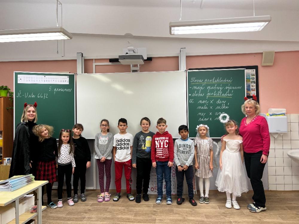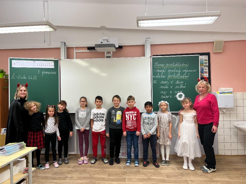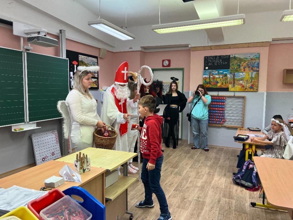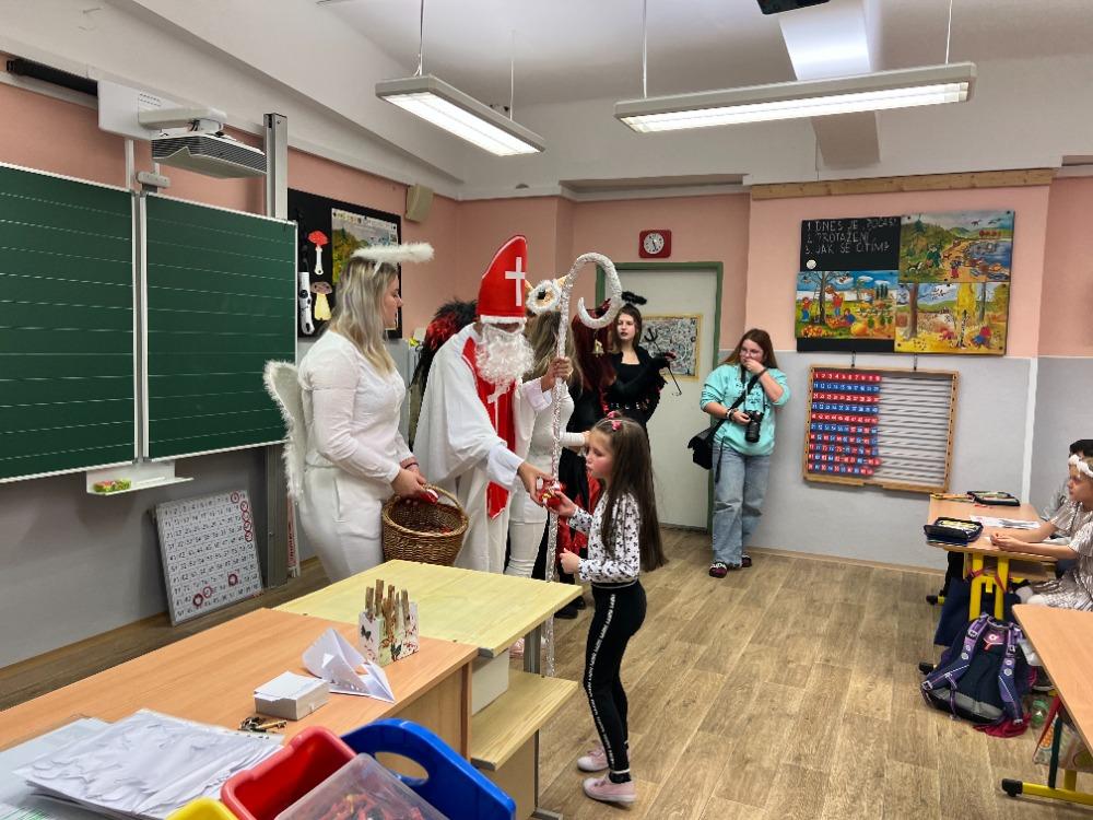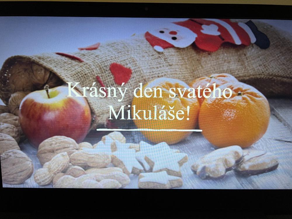 Paní asistentka si pro nás připravila prezentaci, kde nám osobnost svatého Mikuláše představila. Dozvěděli jsme se, že Mikuláš byl moc hodný, pomáhal chudým, nemocným, dětem, i nespravedlivě potrestaným lidem. Později se stal svatým a od středověkého období (od doby vlády lucemburských panovníků) u nás panuje zvyk, že postava Mikuláše, doprovázena andělem a čertem navštěvuje všechny děti a naděluje jim ovoce či drobnosti. Na závěr povídání jsme si dali menší kvíz, jak moc jsme dávali pozor. Uměli jsme odpovědět na všechny otázky. Poté jsme si vymalovali vánoční omalovánky a v pondělí, 5. prosince, nás čekal tzv. "den D", kdy nás měl Mikuláš s čerty a andílky navštívit ve třídě. Sice měli někteří z nás trochu strach, ale zvládli jsme to, zarecitovali básničku, zazpívali písničku a dostali jsme za to sladkou odměnku. Už se moc těšíme na příští rok.