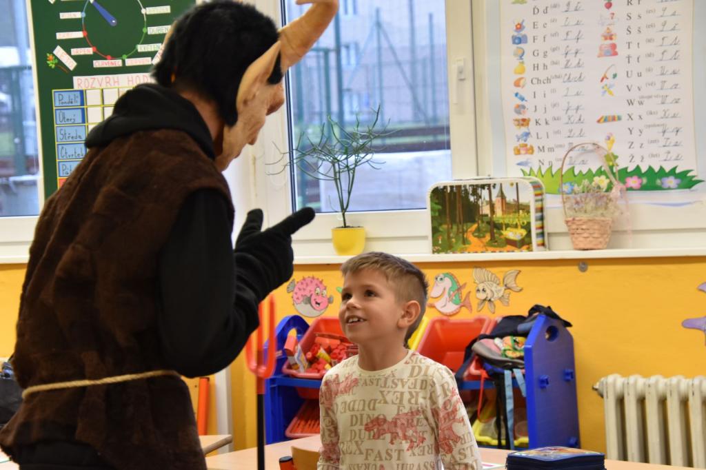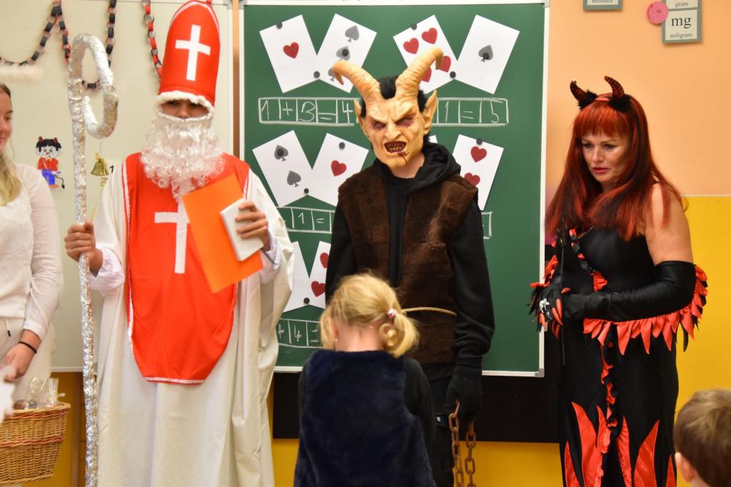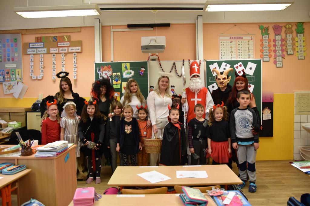 Třída 9. A společně s třídou 9. B pomohli zorganizovat mikulášskou nadílku pro žáky 1. stupně. Ve vlastnoručně vytvořených maskách Mikuláše, Čerta a Anděla navštívili postupně jednotlivé třídy a předali dětem balíčky od jejich třídních učitelek, samozřejmě i se seznamem „hříchů“.