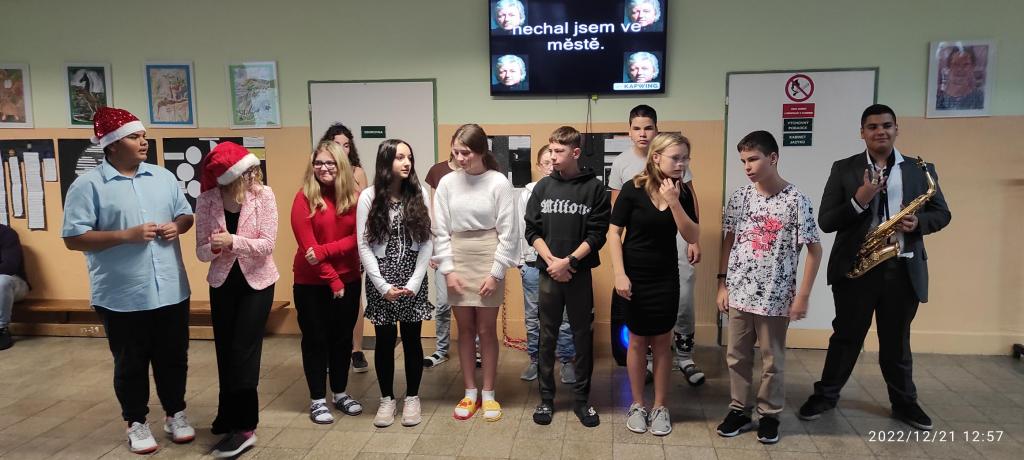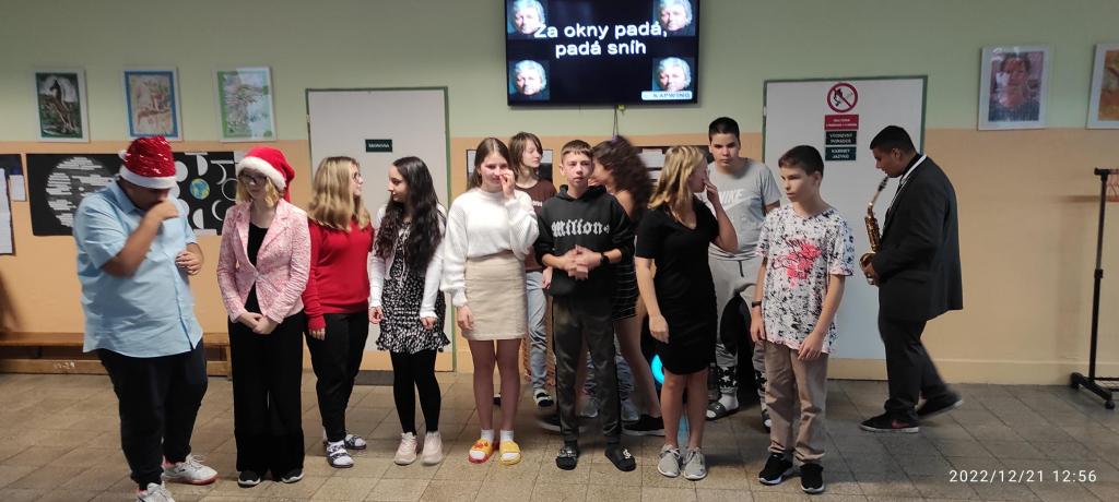 Ve středu 21.12. jsme si společně krom tance ještě na chodbě zazpívali vánoční písničky, které jsme si v rámci hudební výchovy i s choreografií natrénovali. Naše třída měla písničku Last Christmas. Celé to s námi nacvičila paní učitelka Ecklová a moc jí děkujeme!