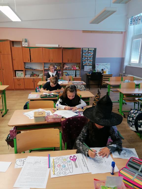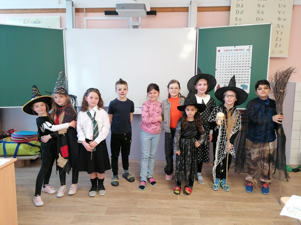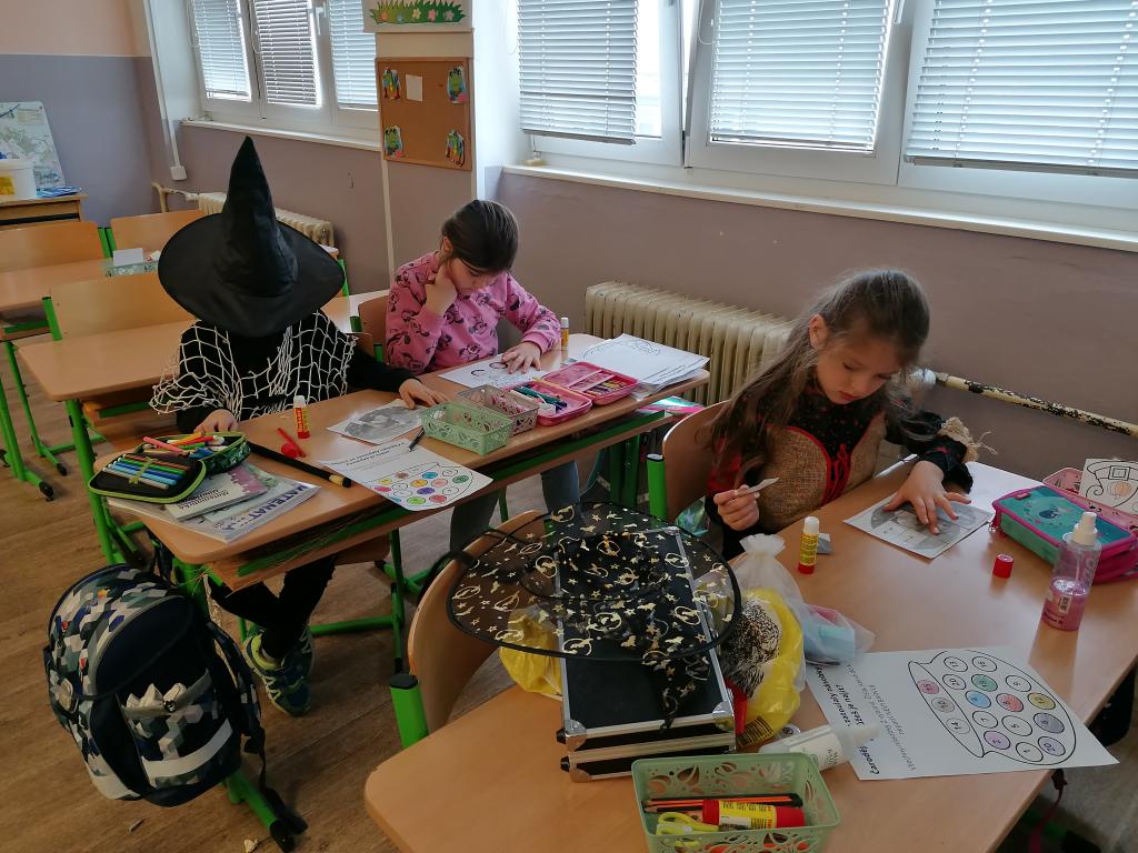 Předchozí den jsme si vyrobili pěknou čarodějnici. V hodinách českého jazyka a matematiky jsme se věnovali zábavným úkolům s touto tématikou. V českém jazyce jsme si procvičili psaní i, y po měkkých a tvrdých souhlaskách, skupiny dě, tě, ně, bě, pě, vě, mě, porozumění textu a pořadí slov ve větě. V matematice jsme si zopakovali násobky 2 a procvičili se ve sčítání a odčítání do 100. Za odměnu jsme si pustili část pohádky Malá čarodějnice.