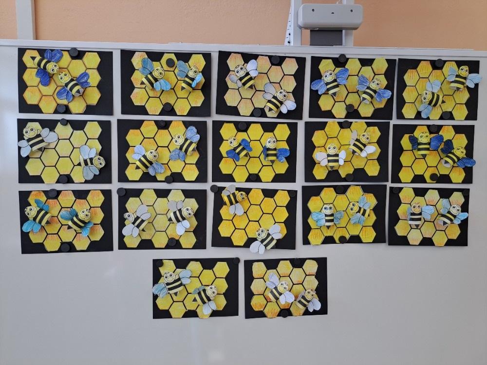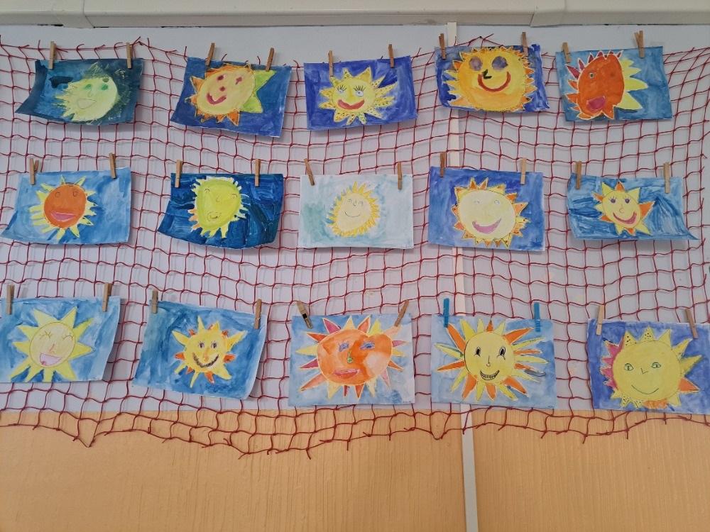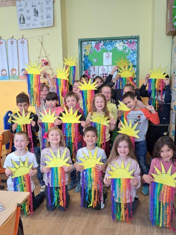 Letošní jaro přicházelo velmi zvolna, pořád bylo chladno a často pršelo. Abychom si jarní počasí a sluníčko přivolali, tvořili jsme s dětmi obrázky s jarními motivy. Děti skládaly včelky z papíru, malovaly sluníčka a lepily krásné duhy z krepového papíru. Všechny naše výtvory nám zdobí nejen naši třídu, ale i chodbu školy.