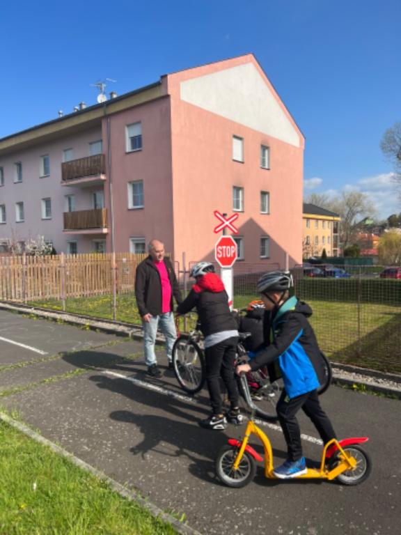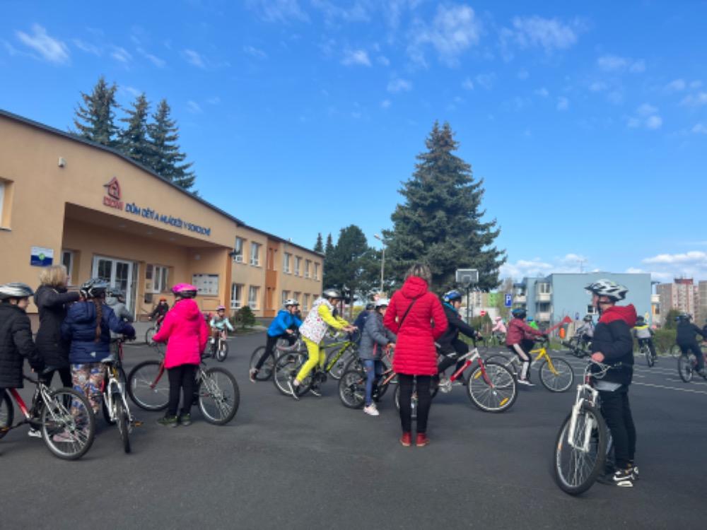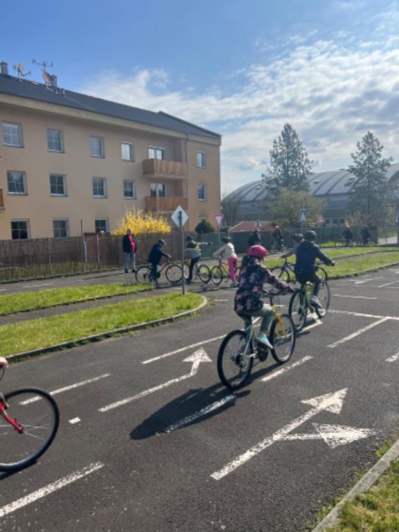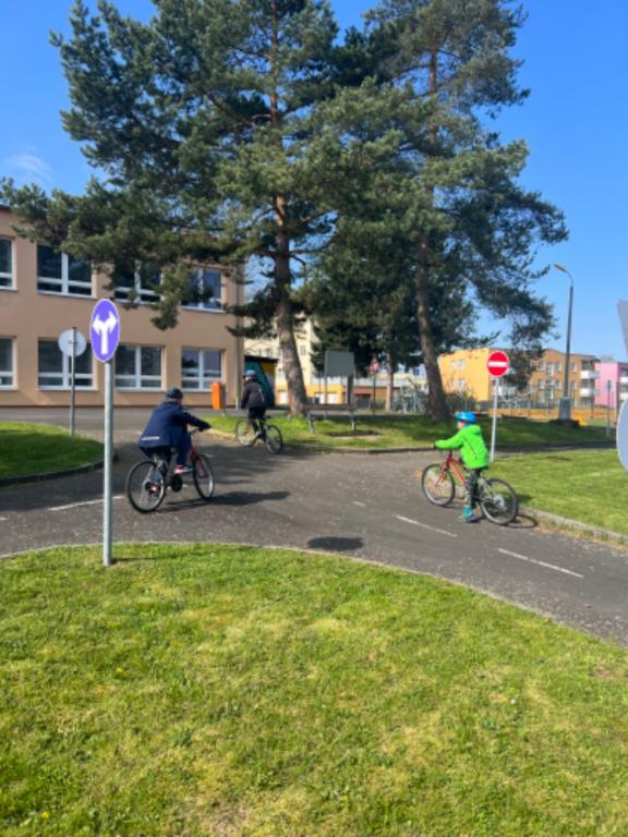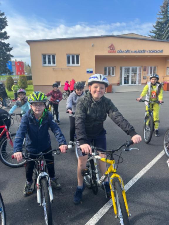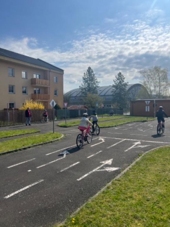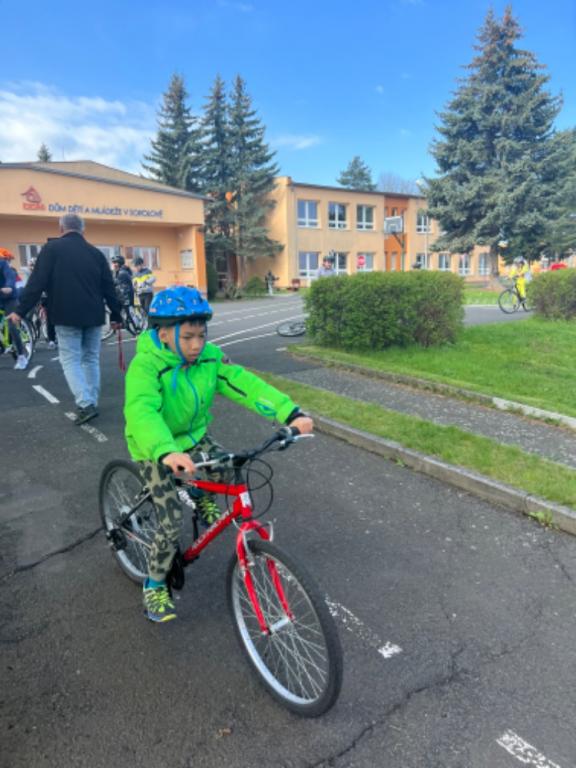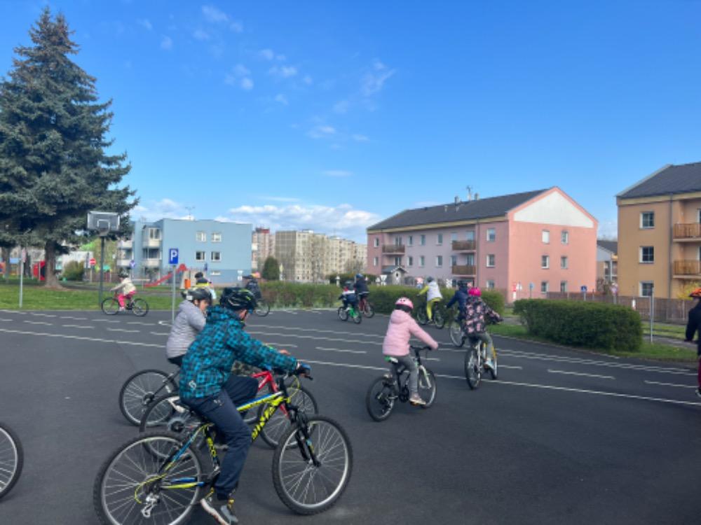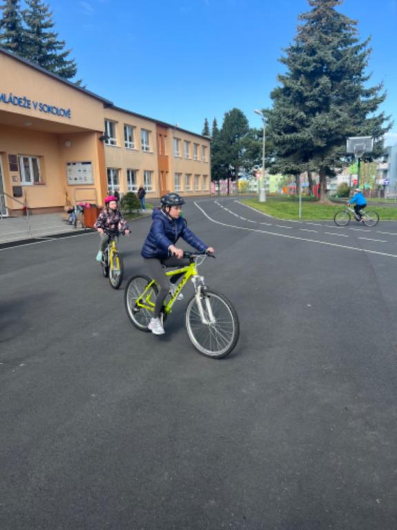 Druhá část byla praktická. Všechny děti dostaly vybavené jízdní kolo a jezdily na dopravním hřišti v DDM v Sokolově. Na jejich jízdu dohlížel pan instruktor i paní učitelky. Děti zkoušely přejíždět vlakové koleje, jezdit na kruhovém objezdu, projíždět křižovatky i správně parkovat.