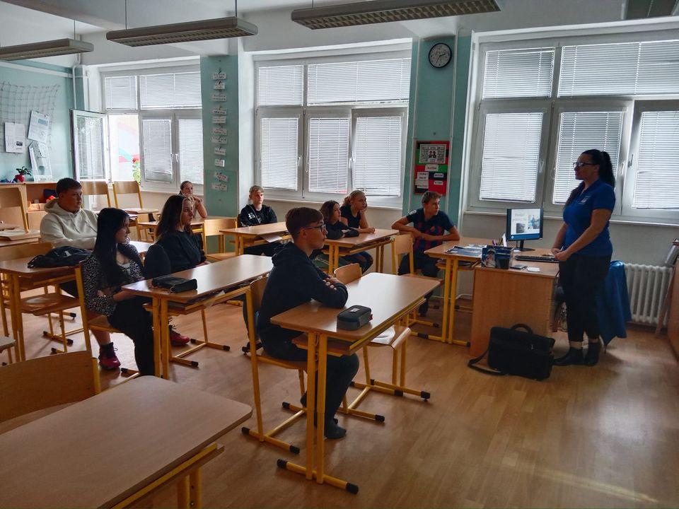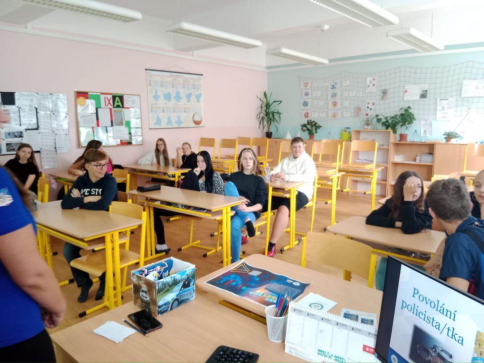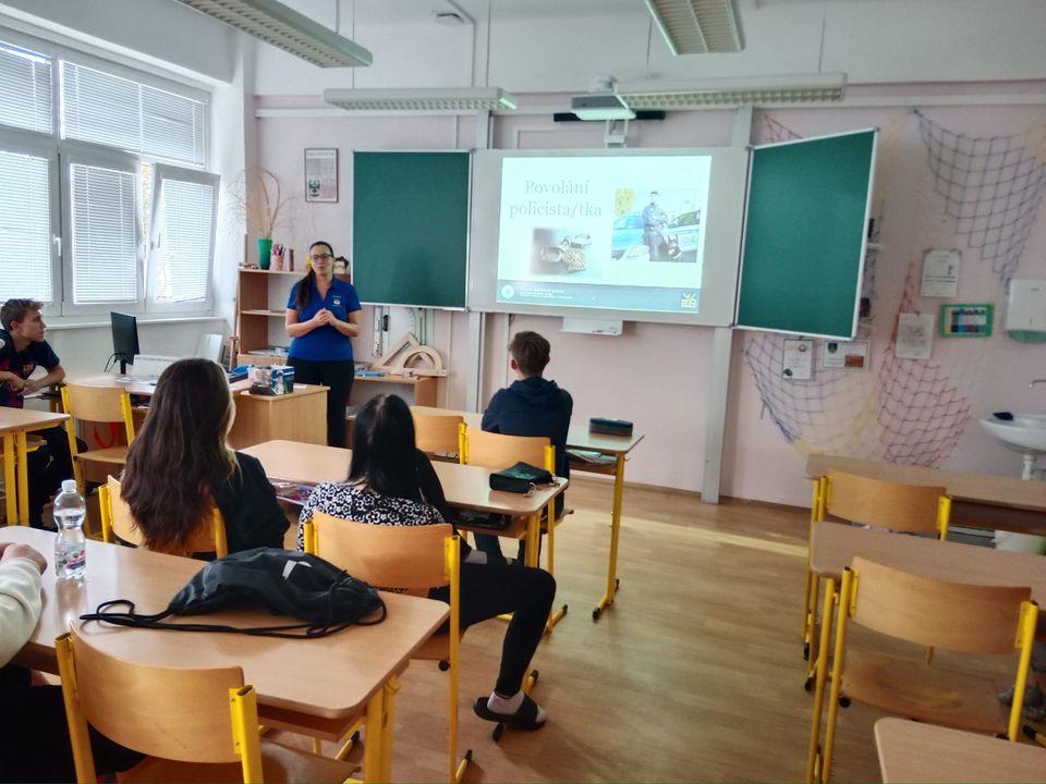 Připravila si pro nás propracovanou a krásnou prezentaci, ve které nám představila, jakou práci můžeme vykonávat po ukončení střední policejní školy. Dozvěděli jsme se něco o náboru policistů a přijímacím řízení policistů – uchazečů o práci policisty. Také jsme se dozvěděli, že v Sokolově bude do 3 roků otevřené nové oddělení, a to oddělení dálniční policie.