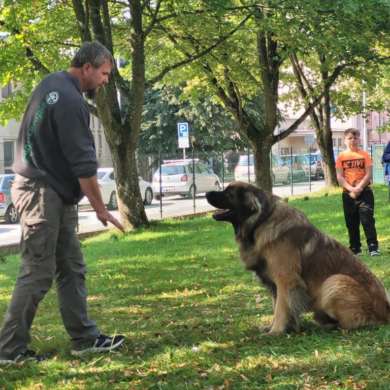 Canisterapie - návštěva pana Bohuslava Stránského s jeho psy. Žáci se seznámili s plemenem leonberger, který i přes svoji výšku a váhu je vhodný jak pro začátečníky, tak i pokročilé. Leon je klidný, přátelský, snadno ovladatelný, pozorný, výborný hlídač. I přes jeho kladné vlastnosti je samozřejmě nutná výchova základní poslušnosti, protože neposlušný leonberger může být katastrofa.