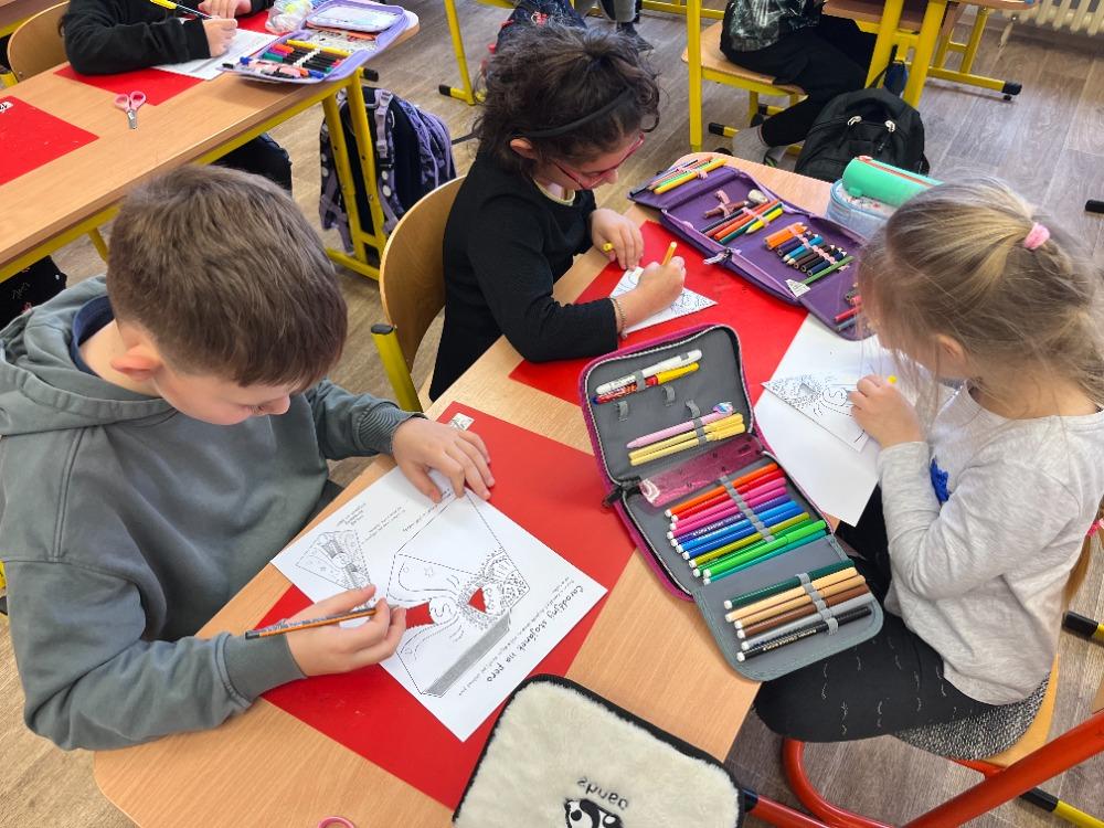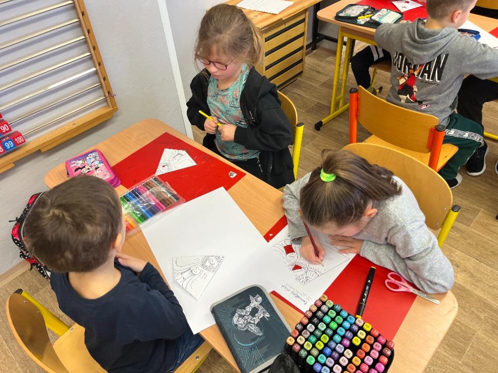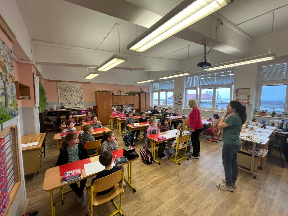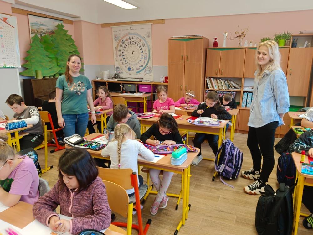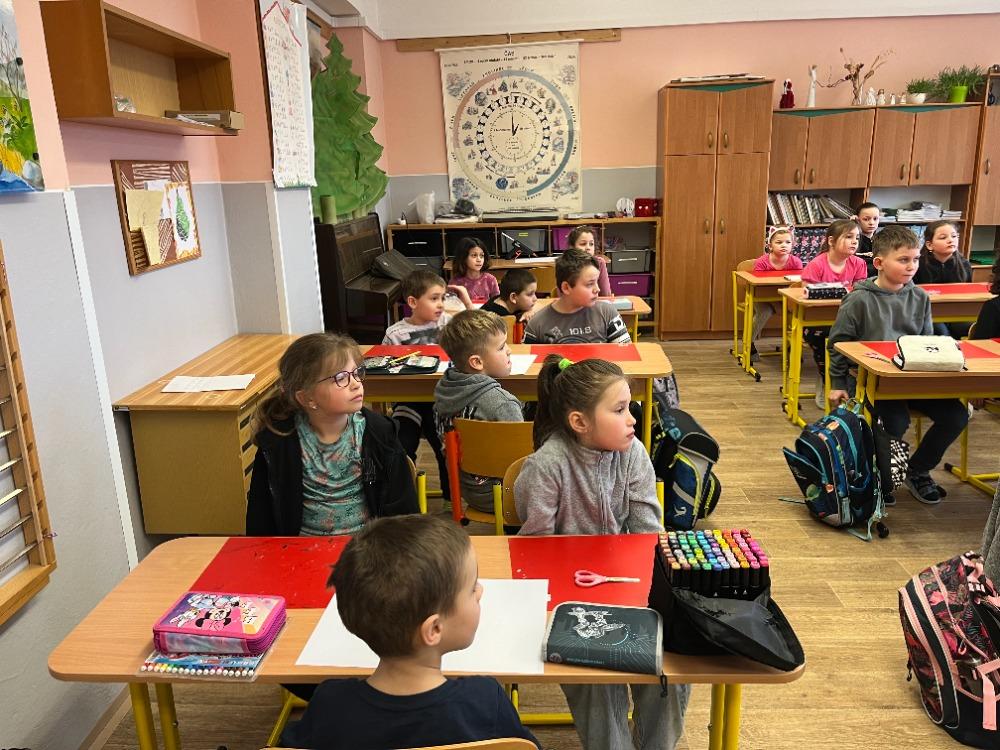 Námětem pro společné vyrábění žáků I. B a III. A se stal nápad, vyrobit malý dáreček pro budoucí prvňáčky k akci "Škola nanečisto". Žáci se sešli ve III. A, aby velcí spolu s malými vyrobili užitečnou drobnost na psací stůl pro předškoláky. Spolupráce se jim dařila, velcí pomáhali malým, nastala doba radování a společného focení.