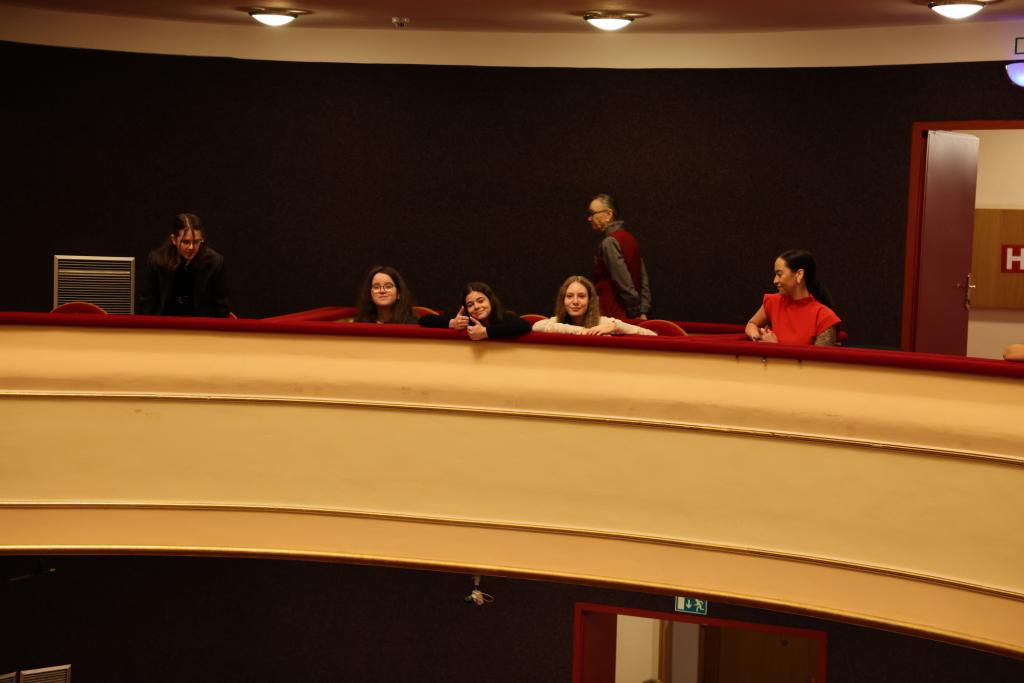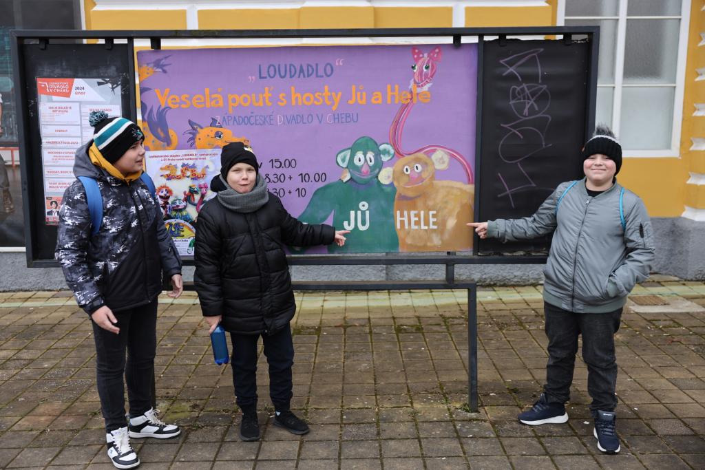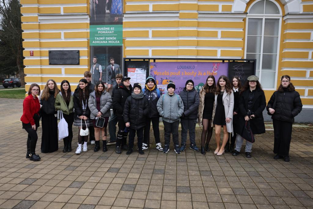 V devět hodin jsme nasedli do autobus, který nás během necelé půlhodiny dopravil před divadlo v Chebu. Zde jsme podstoupili obligátní focení a za pár minut jsme si již mohli hovět v pohodlných sedačkách. Čekalo nás asi dvouhodinové představení, které mělo převážně komediální ráz, ale nepostrádalo také zajímavé lidské poselství o mezigeneračních vztazích v rodině.