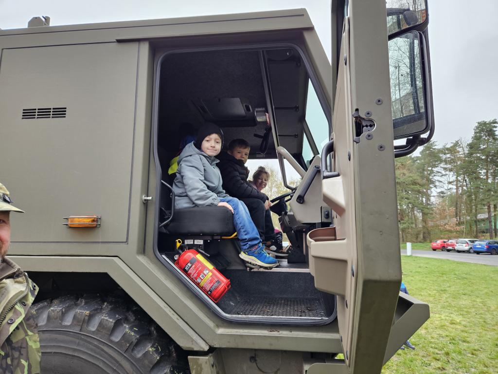 Za vyplněné pracovní listy jsme získali do třídy pexesa s vojenskou tematikou. Žáci též měli možnost nahlédnout přímo do vozu a posadit se za volant.