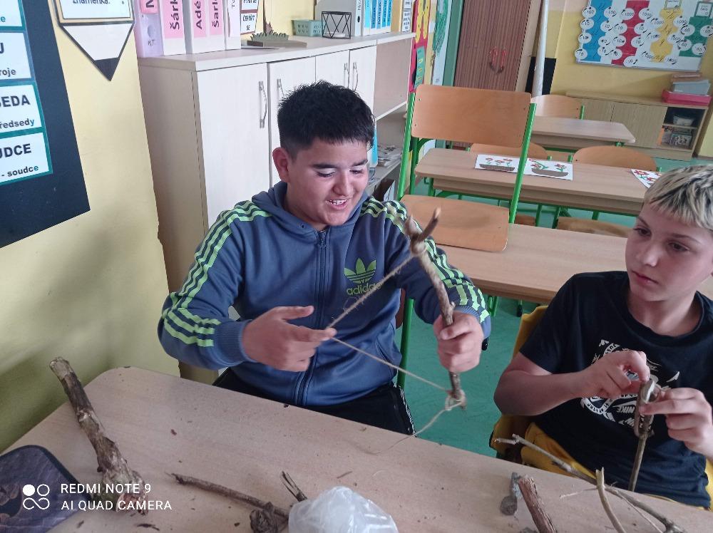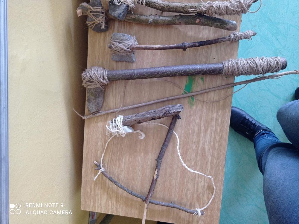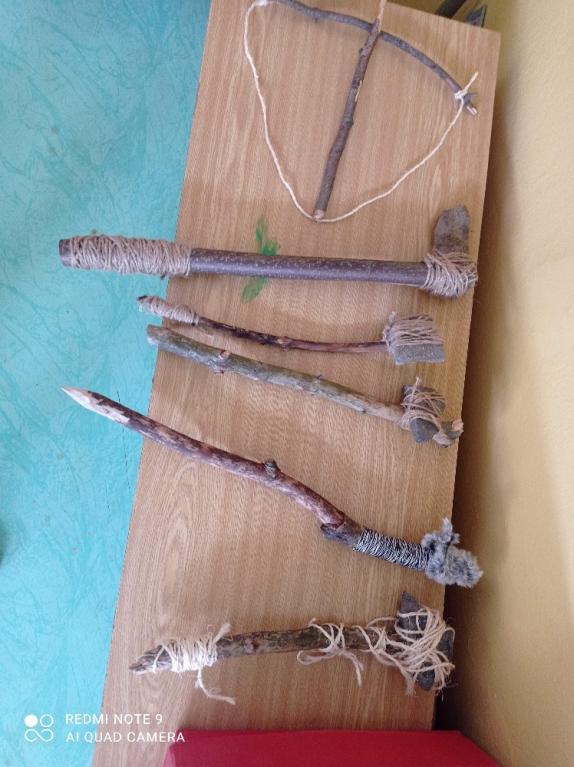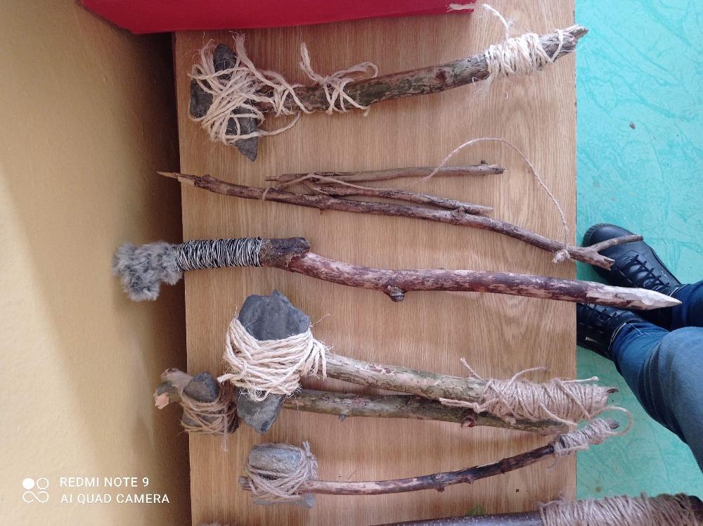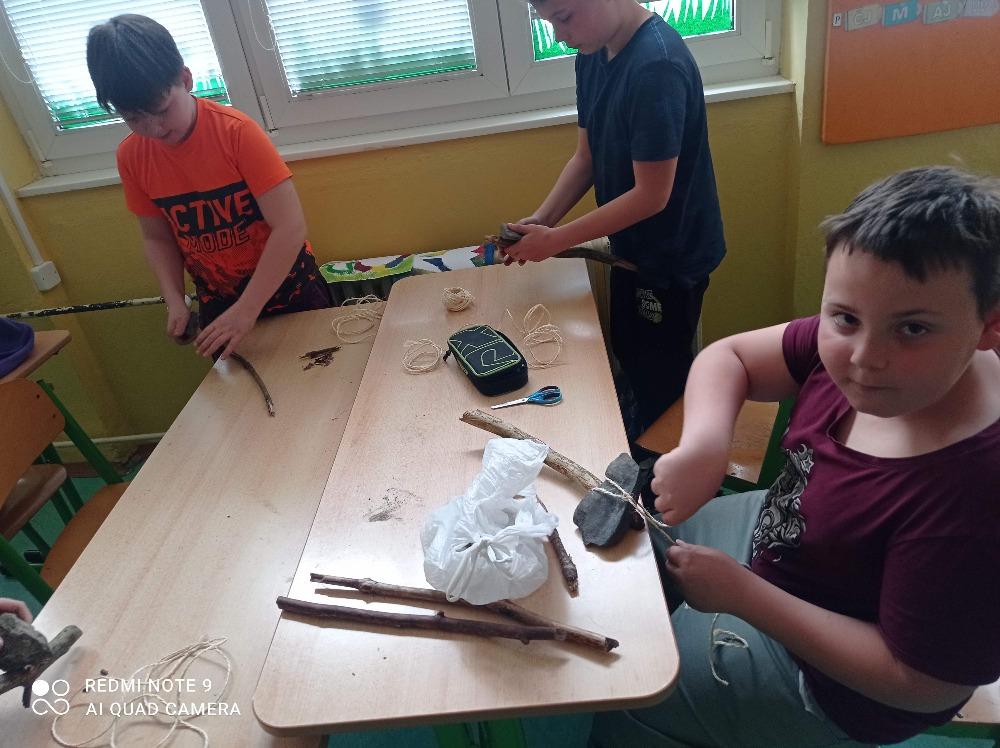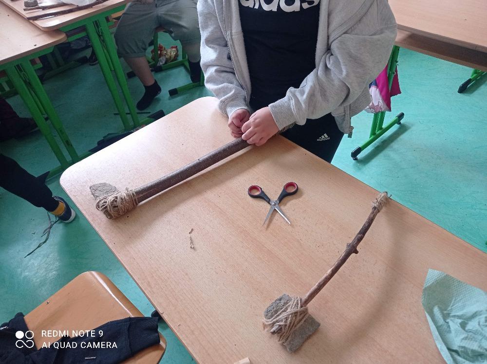 V rámci výuky vlastivědy si žáci vyrobili vlastní pravěké nástroje z doby kamenné. Jednalo se především o sekery, šípy a luky. K výrobě nám postačilo pár klacků, kamenů a lýkový provaz.