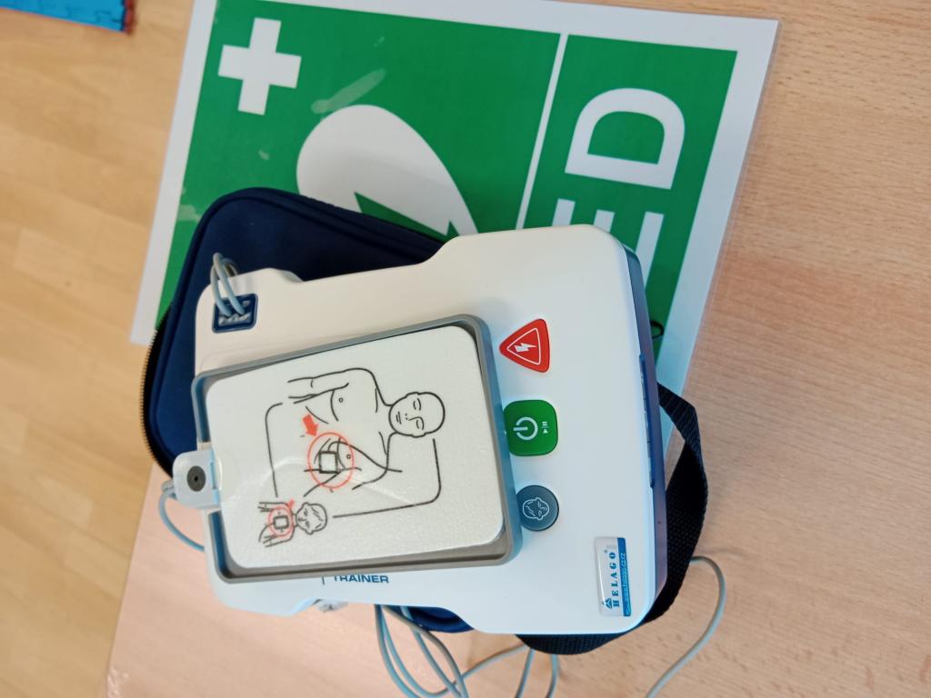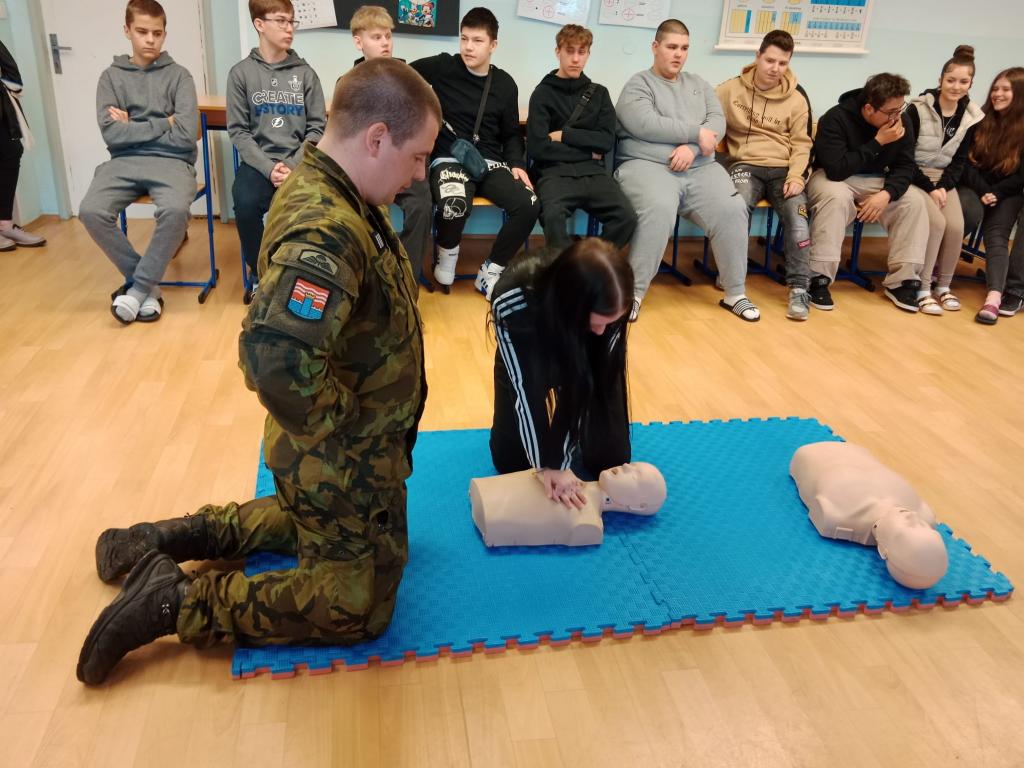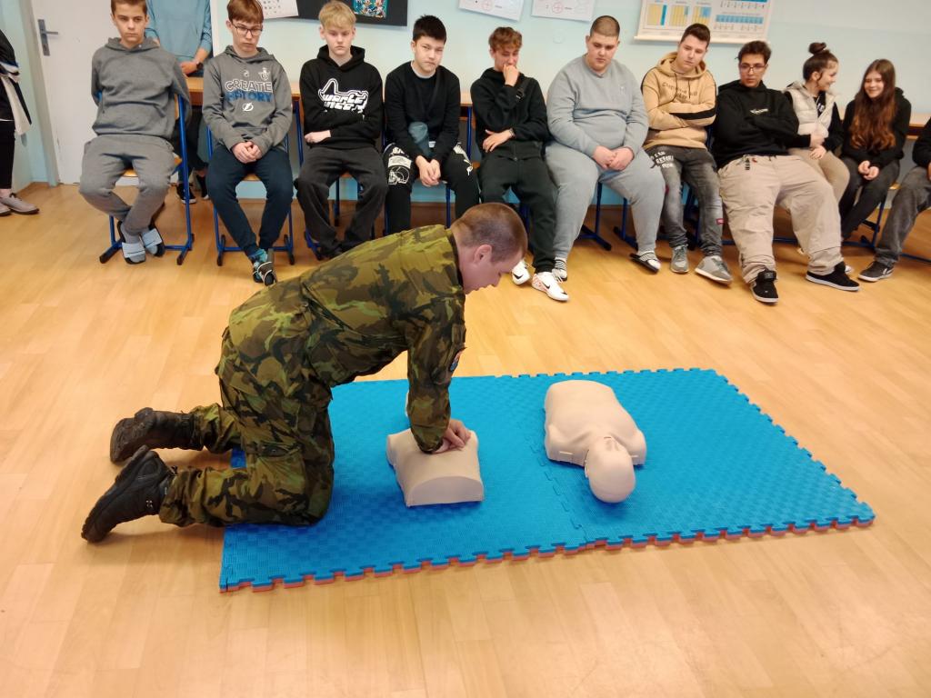 Dalším stanovištěm byla zdravotnická přednáška s praktickými ukázkami. Žáci si zopakovali zásady při poskytování první pomoci a mohli se podívat na práci s defibrilátorem a následně si všichni přítomní na figurínách vyzkoušeli techniku masáže srdce (figurína dítěte i dospělého).