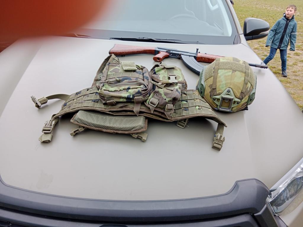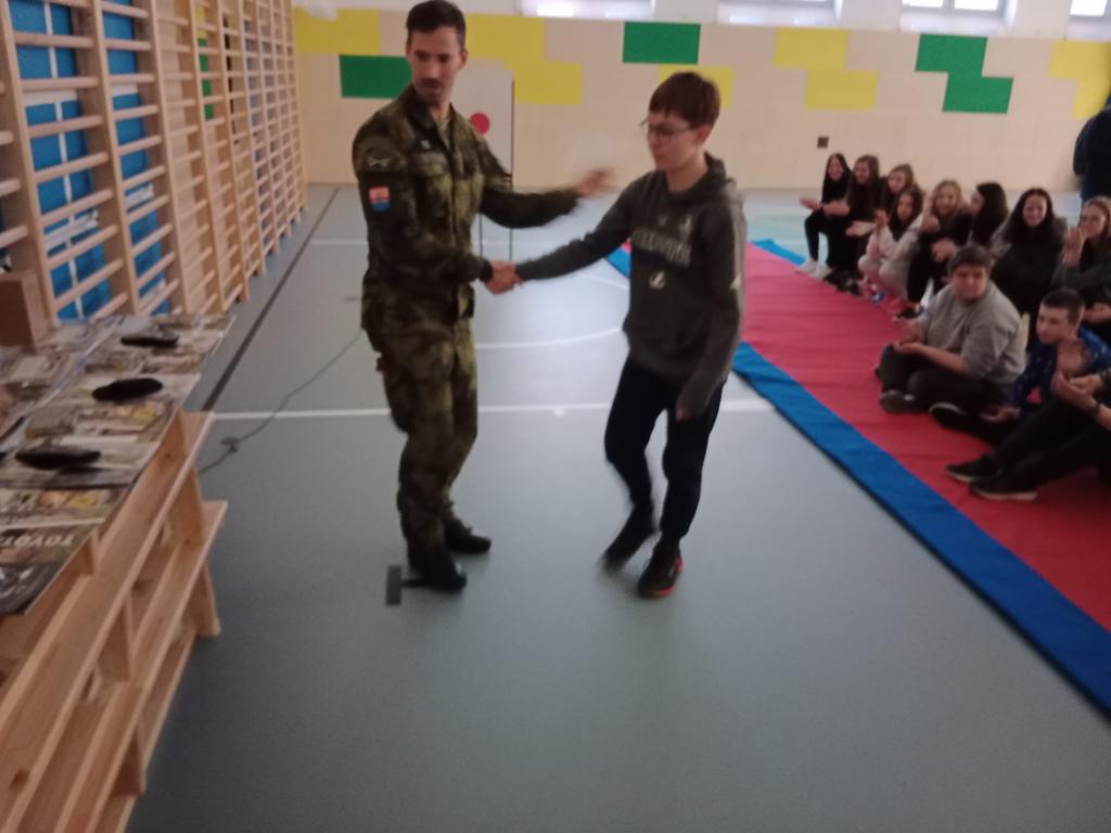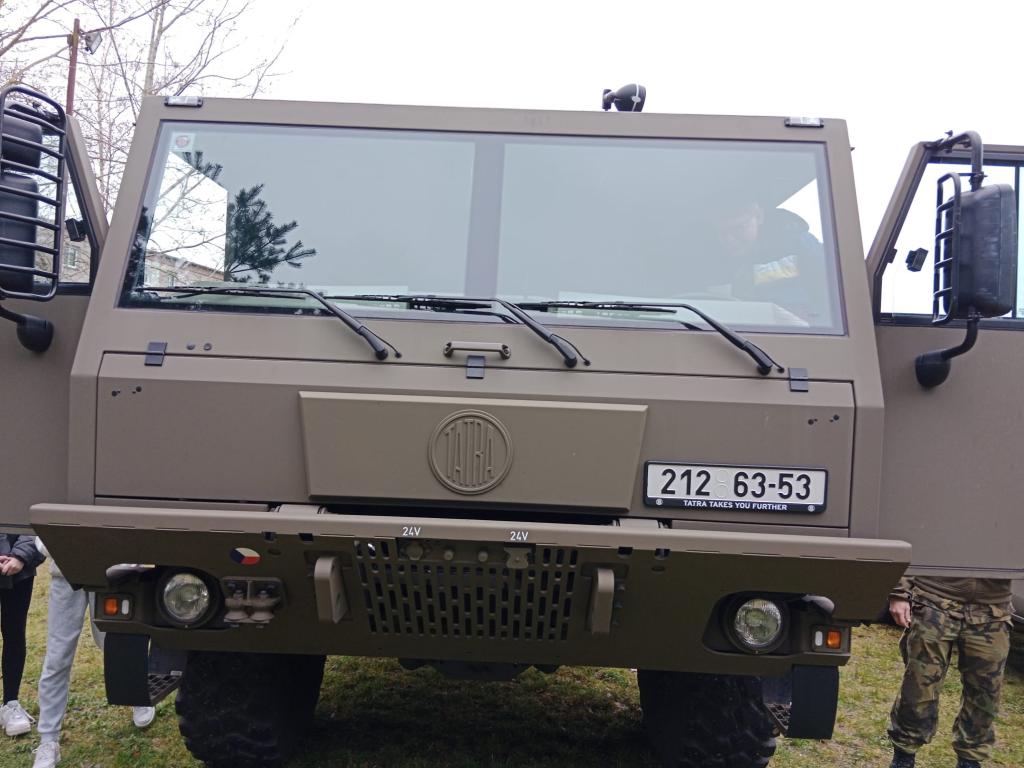 Poté jsme se přesunuli na sportovní hřiště u školy, kde na nás čekali dva instruktoři, kteří děti seznámili s účelem dvou vozidel, které zde byly přistavené a připravené pro zkoumání odvážných jedinců. Také žákům ukázali základní výstroj českého vojáka, kterou si žáci měli možnost vyzkoušet, a to i v náročnějších zátěžových situacích.