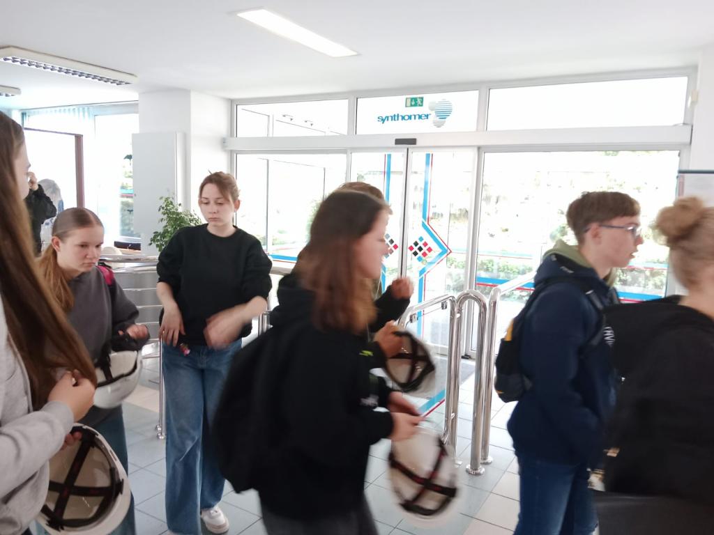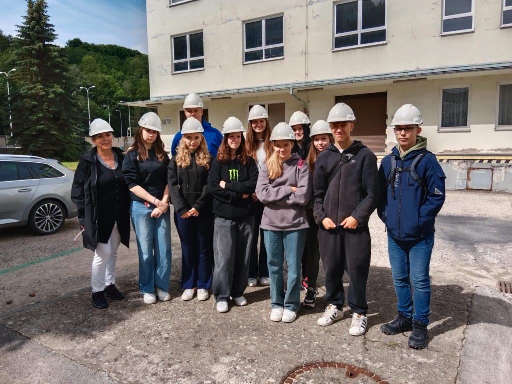 Na začátku naší exkurze jsme vyfasovali slušivou ochranu hlavy, kterou nám předal náš průvodce pan Hanuš Slavík. Poté jsme se vydali prozkoumat areál podniku.