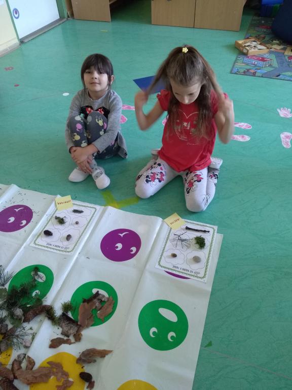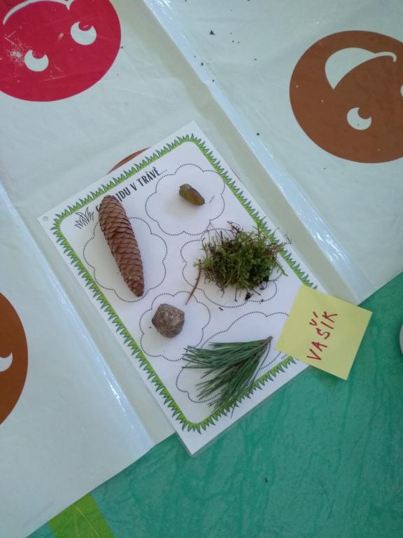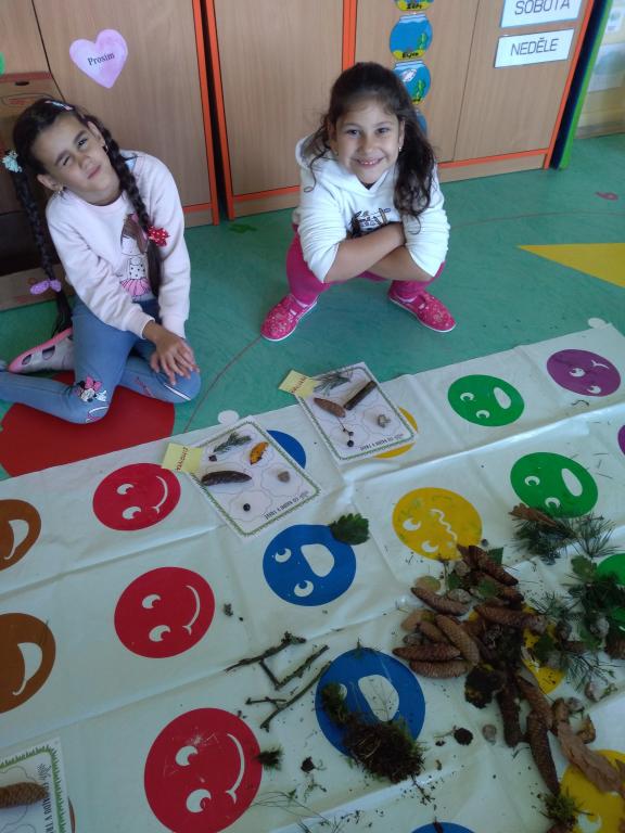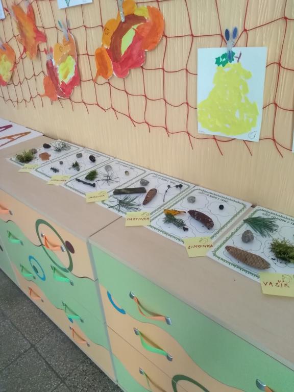Na podzimní procházce do lesa jsme hledali přírodniny. Ve třídě jsme je pojmenovali a poskládali na připravené folie. Přírodniny jsme si vystavili.