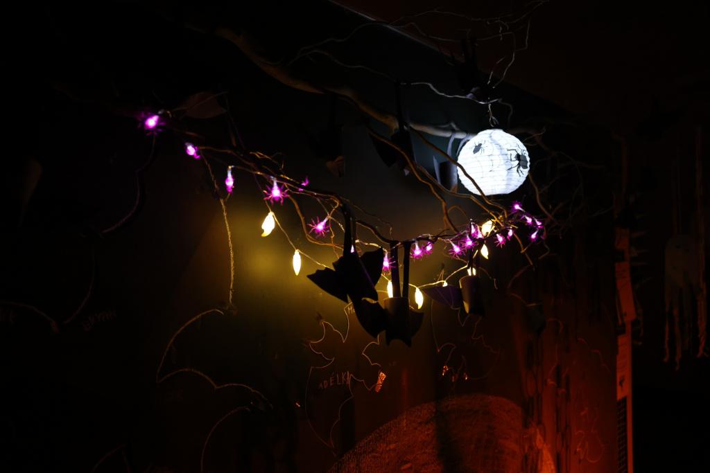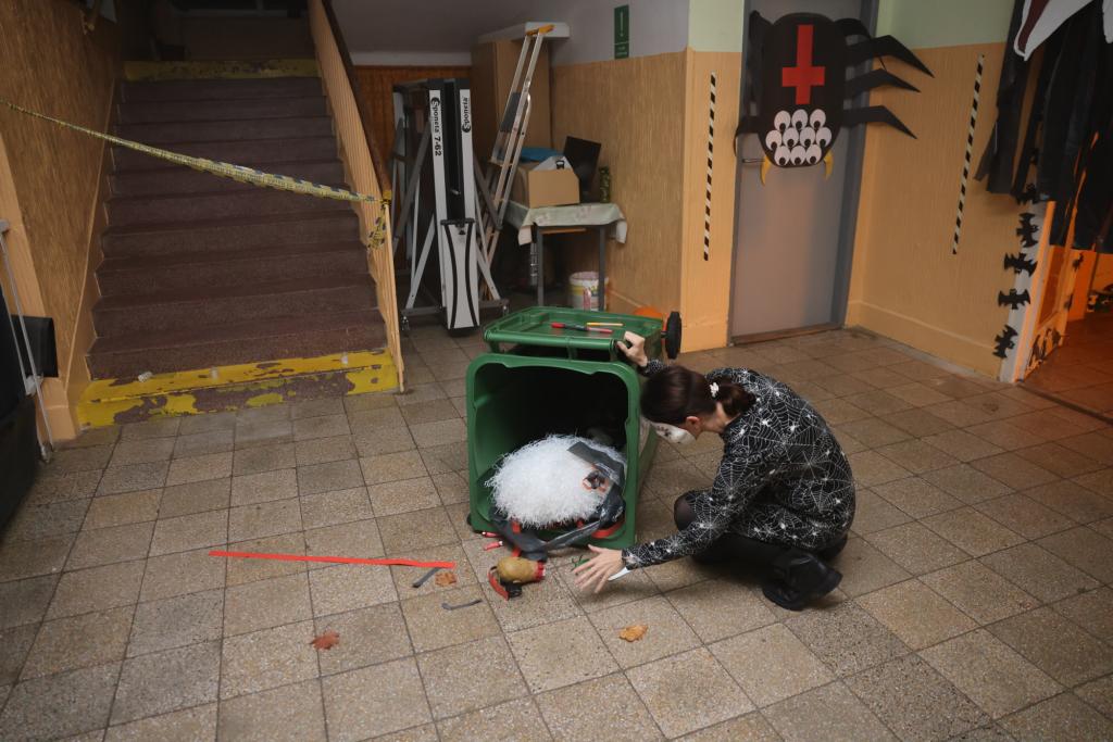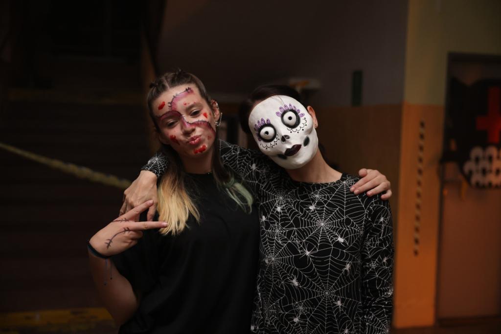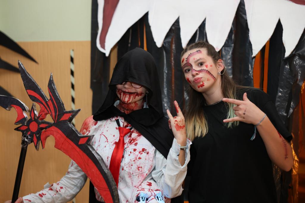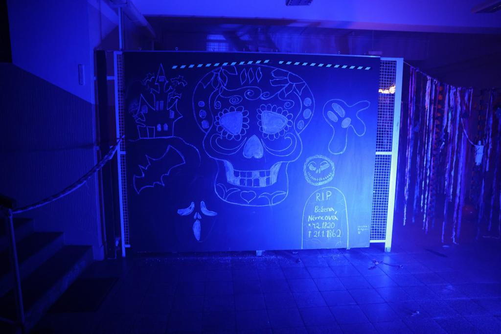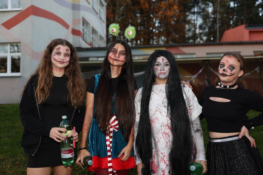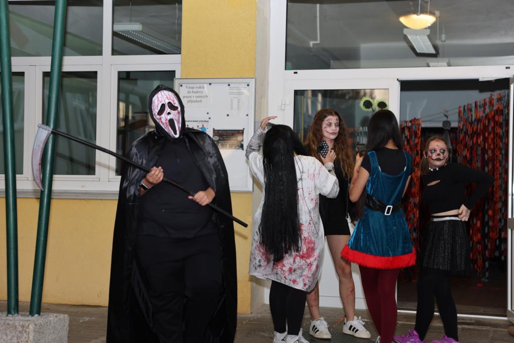 Konkrétně se jednalo o Elišku, Káťu, Amandu, Samantu a Štěpánku, které se rozhodly v pátek 25. října věnovat několik hodin svého volného času, aby pomohly pedagogům naší školy zrealizovat halloweenskou stezku, kterou již několikátým rokem v tomto období pořádáme pro žáky prvního stupně. Děvčata neponechala nic náhodě a řádně se vyšňořila. S předstihem byly dívky seznámeny se svými úkoly, které po dokončení výzdoby školy pak po více jak tři hodiny pečlivě plnily. Nutno však podotknout, že zvláště u starších dětí, tedy čtvrťáků a páťáků si také náležitě užily okamžiky, kdy mohly někoho vystrašit či polekat. Já si zase dosyta užil chvíli, kdy jsem toto prostřednictvím skřehotavého smíchu tak trochu vrátil Elišce. Každopádně děvčatům po právu náleží velké poděkování za jejich pomoc, vždyť i právě díky ní mohla být stezka tak rozsáhlá a děsivá.