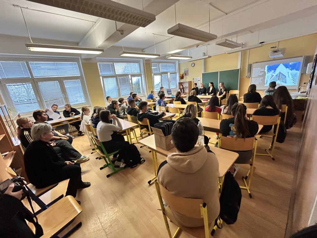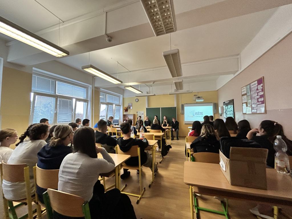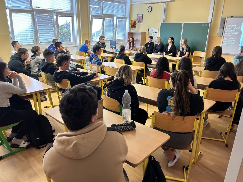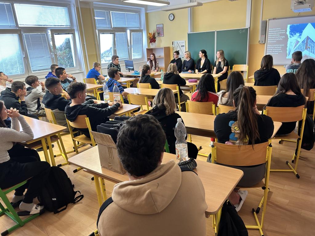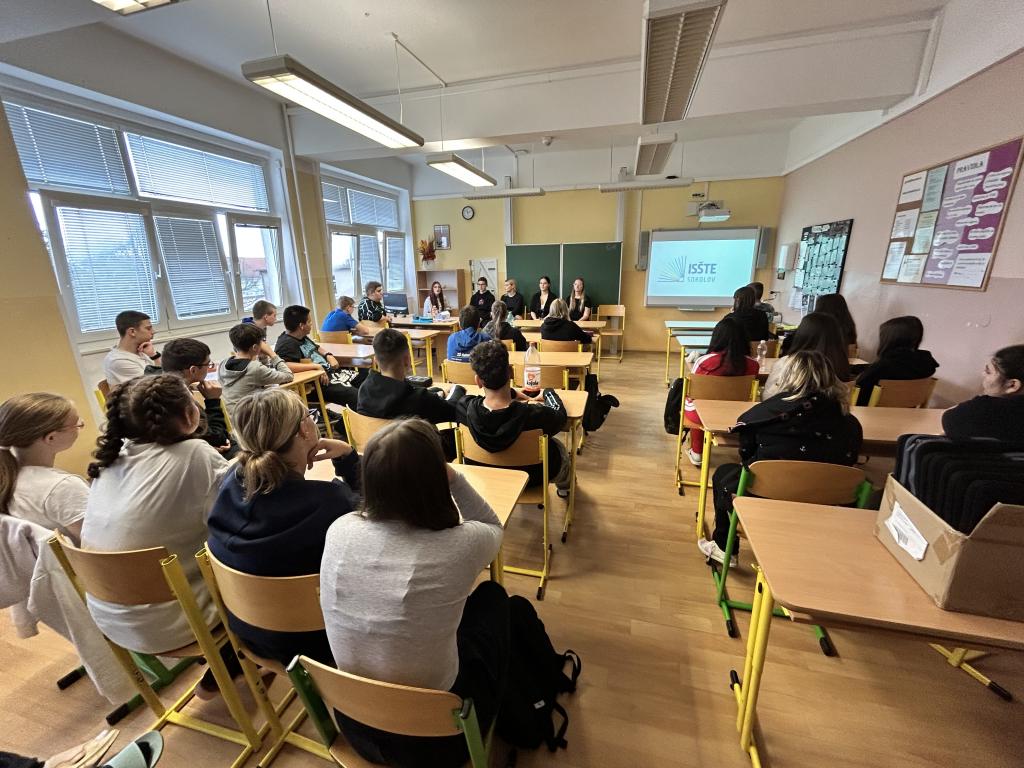 V úterý 12. listopadu nás navštívili studenti ISŠTE. Každý představil obor, který studuje a profesory či mistry odborného výcviku. Překvapila nás dívka, která studuje druhým rokem obor automechanik, svým zajímavým povídáním doplněným skvělou prezentací. David nás seznámil s dalším učebním oborem. Nikdo z nás netušil, co všechno musí znát vyučený odborník, který umí obrábět kovy. Veřejnosprávní činnost připraví své studenty na práci v bance, či pro práci na úřadech. Ekonomika a podnikání naučí, jak vést firmu, vedení účetnictví, jak pracovat se zaměstnanci, jak podnikat, co je legální či nelegální a jakými zákony se řídit. V prezentacích jsme procházeli moderní školou, která nabízí nejen perfektní vybavení, ale i mnoho zajímavých aktivit. Kdo rád čte, má k dispozici školní knihovnu. V zimě se mohou studenti vyřádit na sněhu na lyžařském kurzu, v létě na turisťáku. Kdo z nás by nechtěl na lodích sjíždět řeku Ohře. Domů se vrátí jistě všichni plni prima zážitků. Také o obědy je postaráno. Jídlo zajišťuje SOKOREST nejen pro studenty ubytované na internátu. Je zajímavé vidět školu „očima studentů“. Byl to pro nás nevšední zážitek.