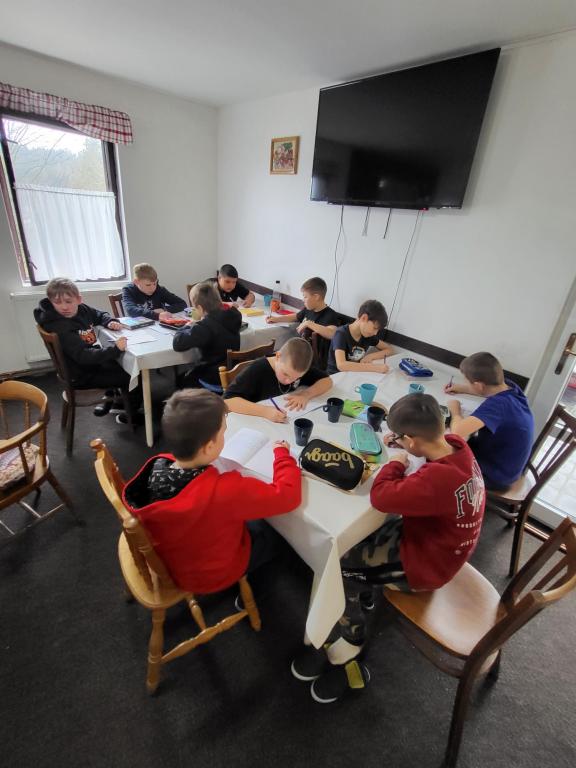 Dnešní ráno jsme zahájili opět výbornou snídaní, která nám dodala energii na celý den. Bohužel hned poté začalo vydatně pršet, ale ani to nás nezastavilo! Společenskou místnost jsme proměnili v centrum zábavy a vzdělávání – hráli jsme hry na zopakování učiva, starší žáci tvořili napínavý pirátský příběh a mladší s nadšením poslouchali dopisy od rodičů, které jim předčítala paní učitelka. Odpovědi na dopisy jsme psali s radostí a úsměvem na tváři.