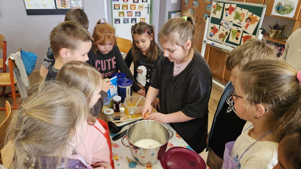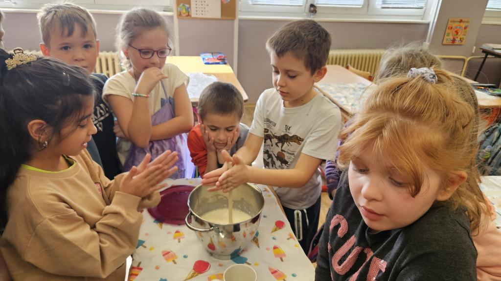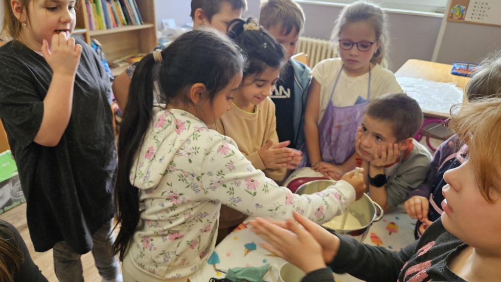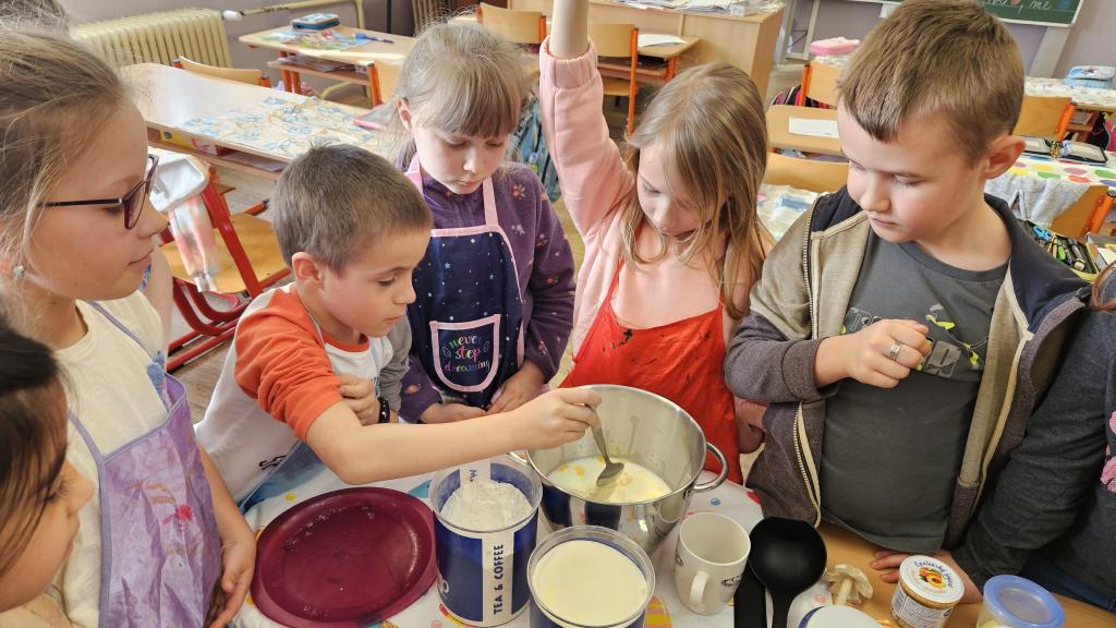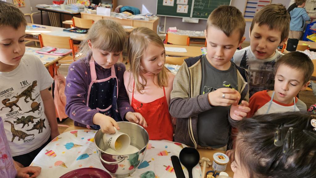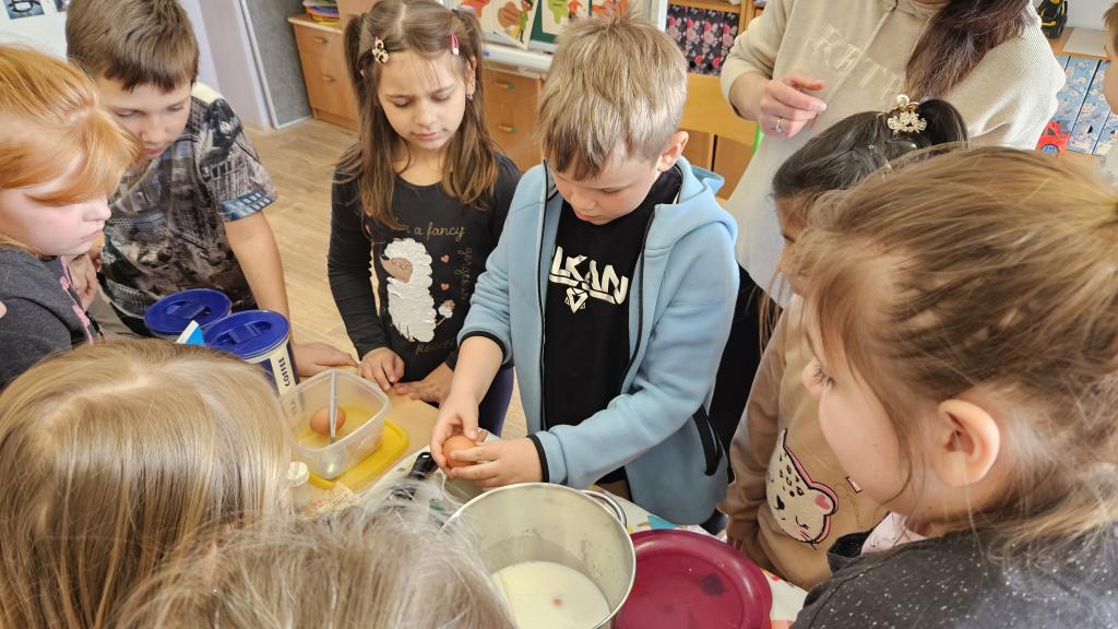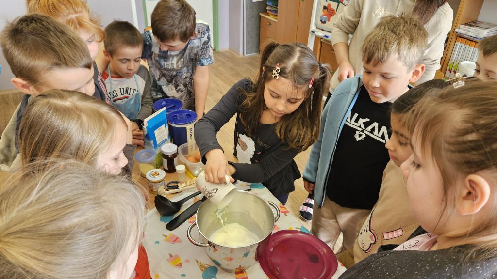 Během dnešního vyučování si děti vyzkoušely postup přípravy těsta na palačinky. Odměnou jim byla vlastní ochutnávka výborných palačinek s marmeládou.