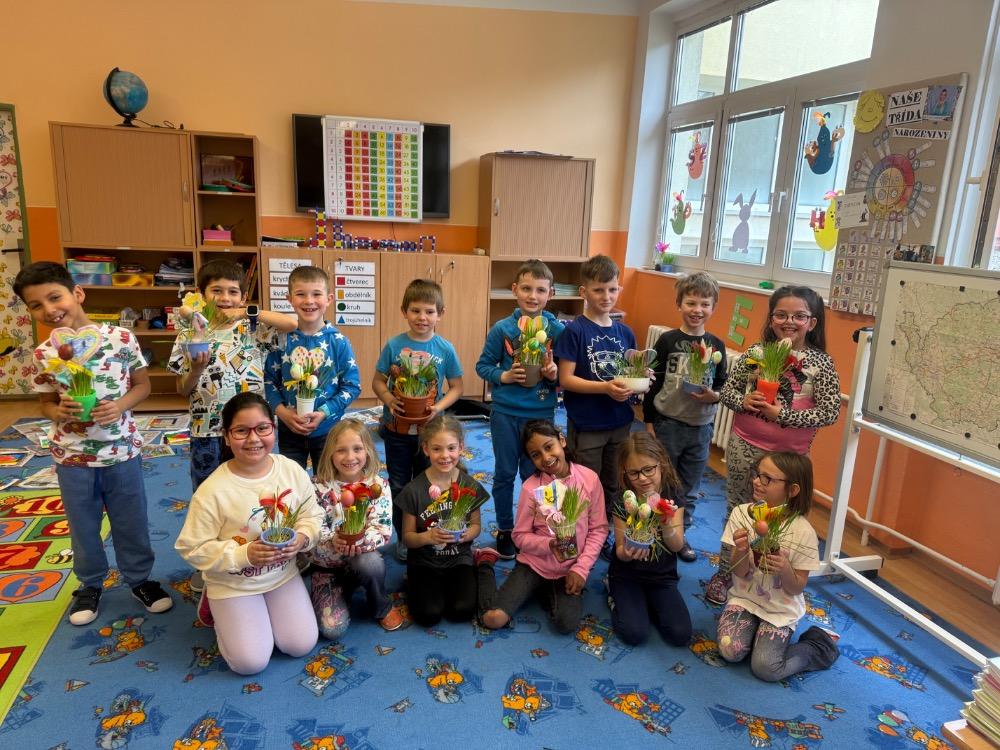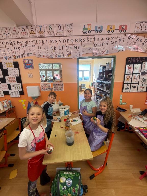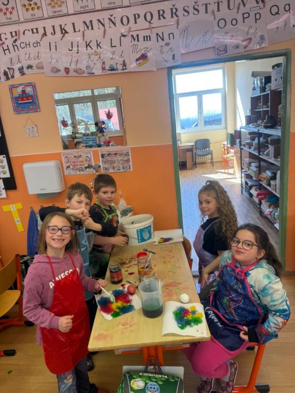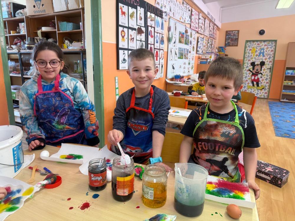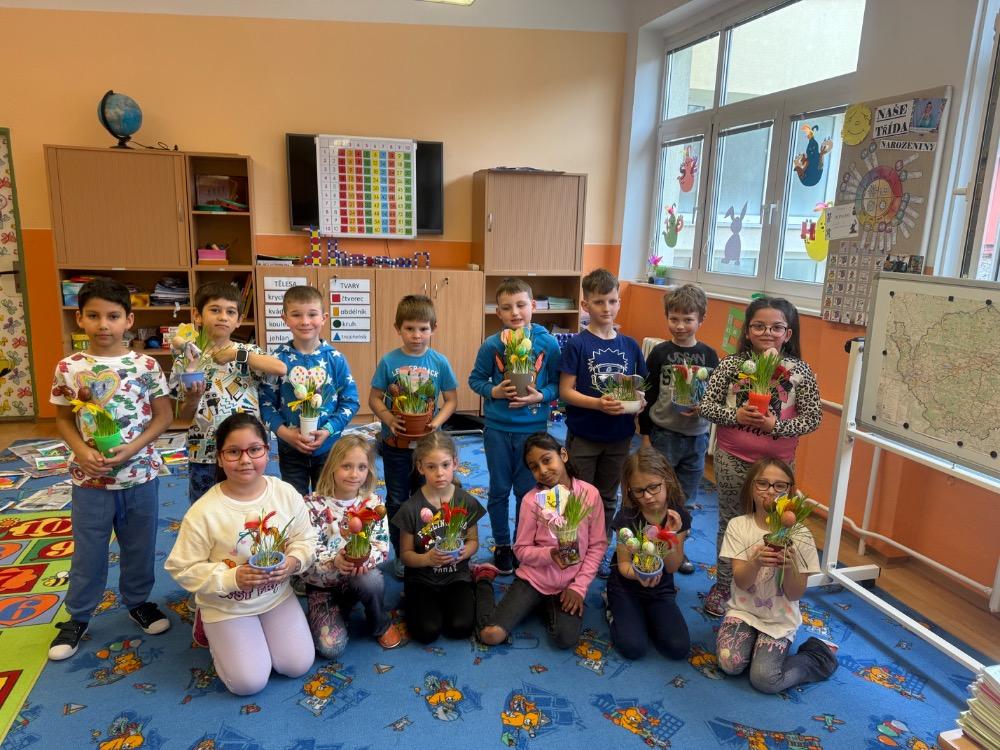 S blížícími se Velikonocemi jsme si ve třídě 1. A v rámci pracovní a výtvarné výchovy zkoušeli barvit vajíčka ubrouskovou metodou, vyrábět ozdobné zápichy do květináče a sázet velikonoční osení.