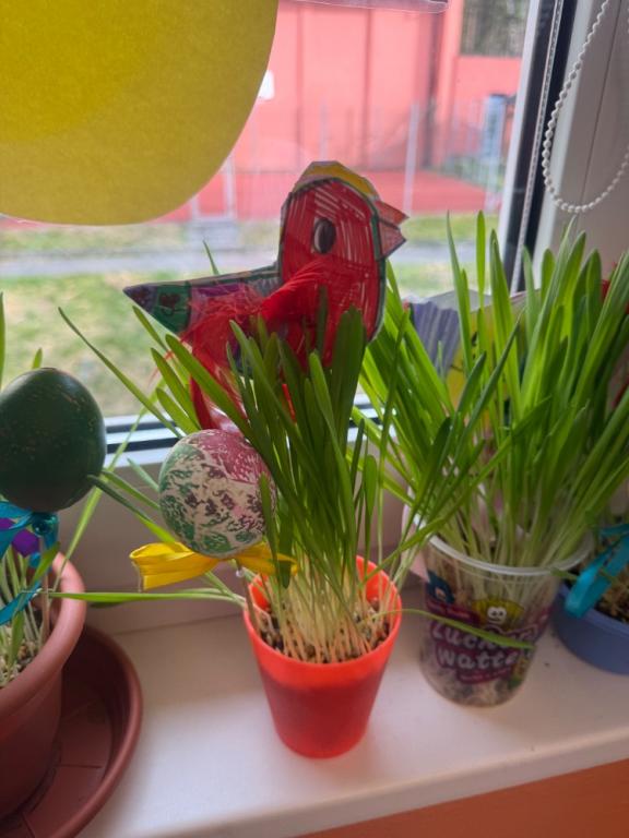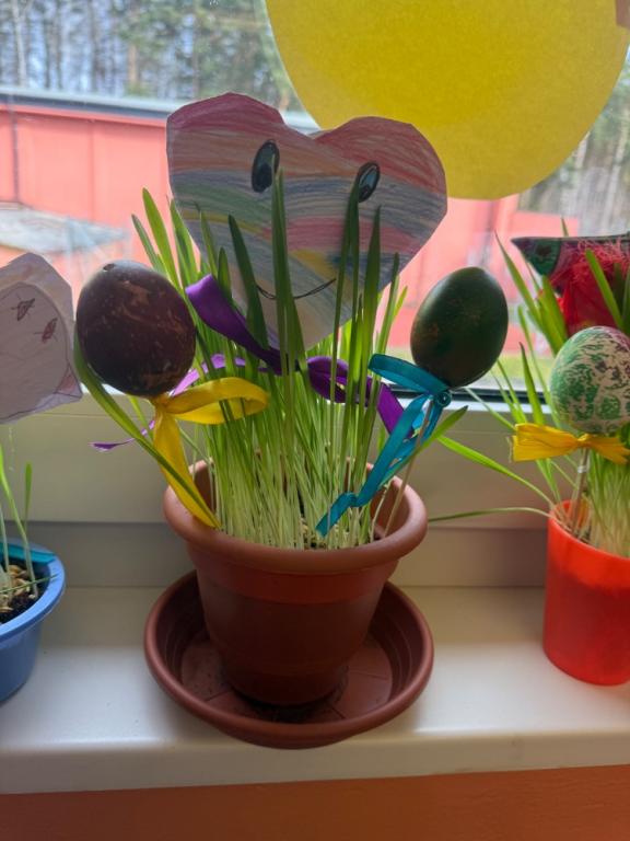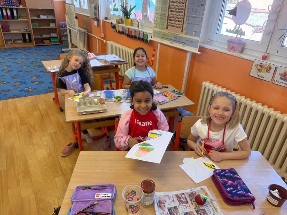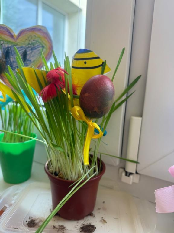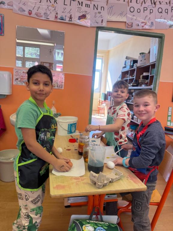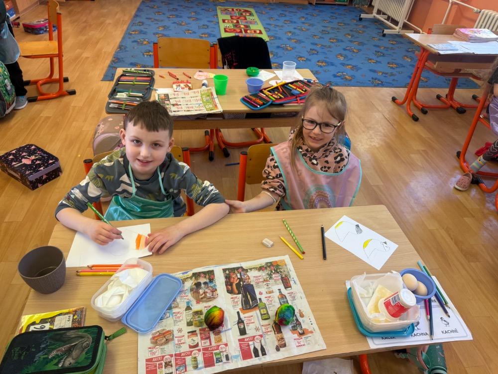 S blížícími se Velikonocemi jsme si ve třídě 1. A v rámci pracovní a výtvarné výchovy zkoušeli barvit vajíčka ubrouskovou metodou, vyrábět ozdobné zápichy do květináče a sázet velikonoční osení.